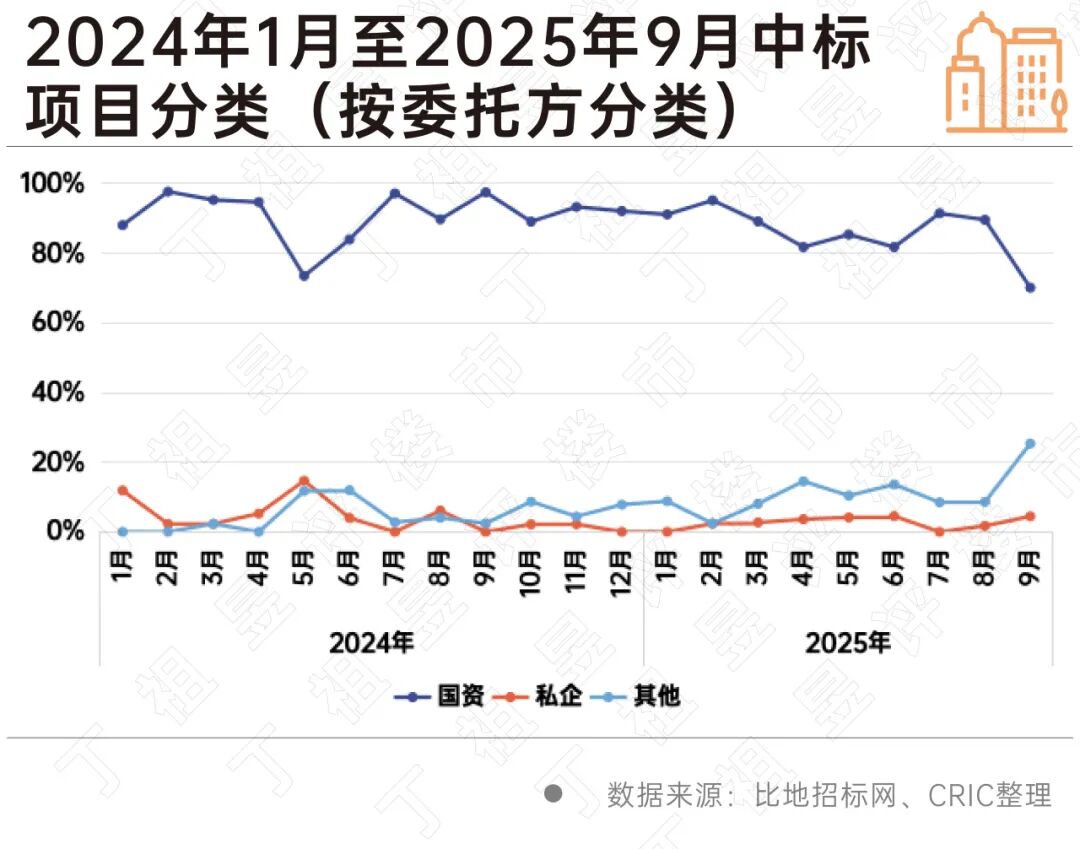 值得注意的是,与2025年上半年相比,第三季度(尤其9月份)政府和国企委托占比有所下滑,9月份来自国资的招投标项目占比降至70%,与前8个月平均水平相比下降了接近20pts。