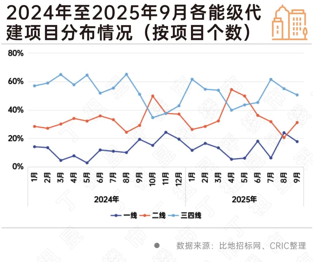 从能级角度看,2025年前三季度一线、二线、三四线中标数量比例分别为14%、35%和51%,三四线为主力、一二线为辅的趋势并未改变。但仅从第三季度来看,一线城市第三季度占比17%,呈现走高趋势,相应地二线城市占比明显回落。