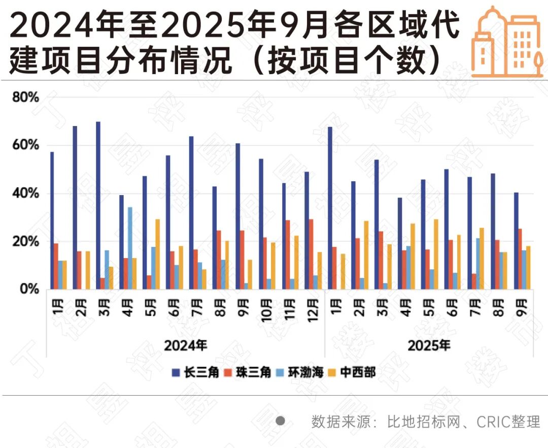 在项目分布层面,2025年第三季度中标代建项目的分布基本与上半年保持一致,三四线、长三角是主力区域:三四线占比仍保持五成左右,长三角占比高位下降、其他区域占比小幅上升。