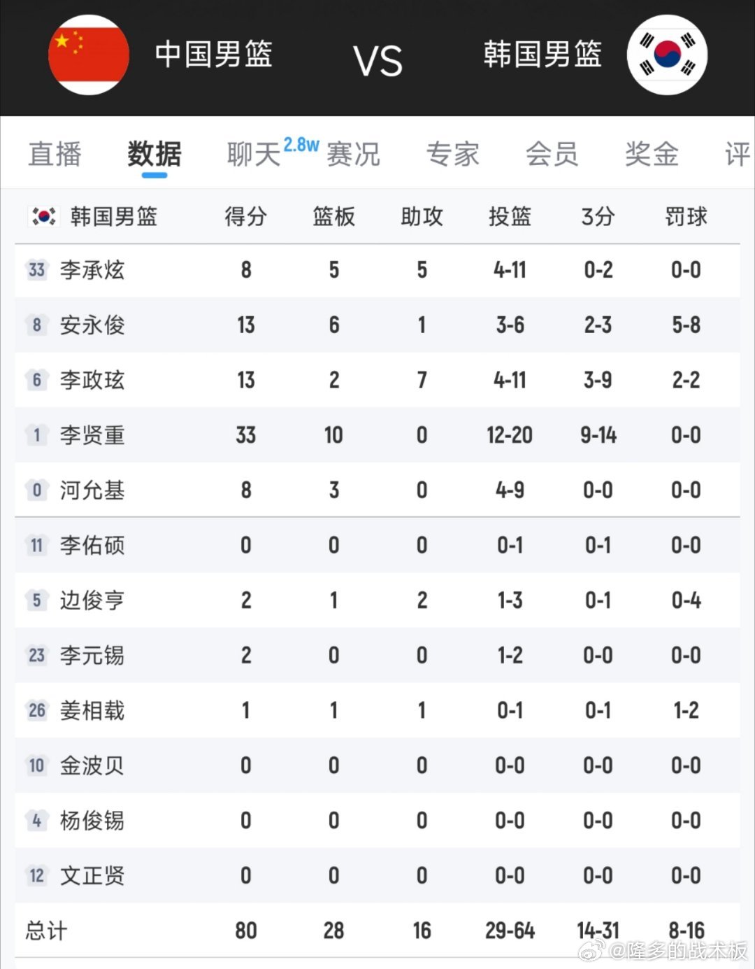 逆转失败,中国男篮世预赛首战76-80不敌韩国,遭遇开门黑。张镇麟20分8板,廖三宁17分,周琦11分12板;韩国李贤重独得33分10板,命中9记三分中国男篮主场不敌韩国男篮中国男篮醒的太晚了