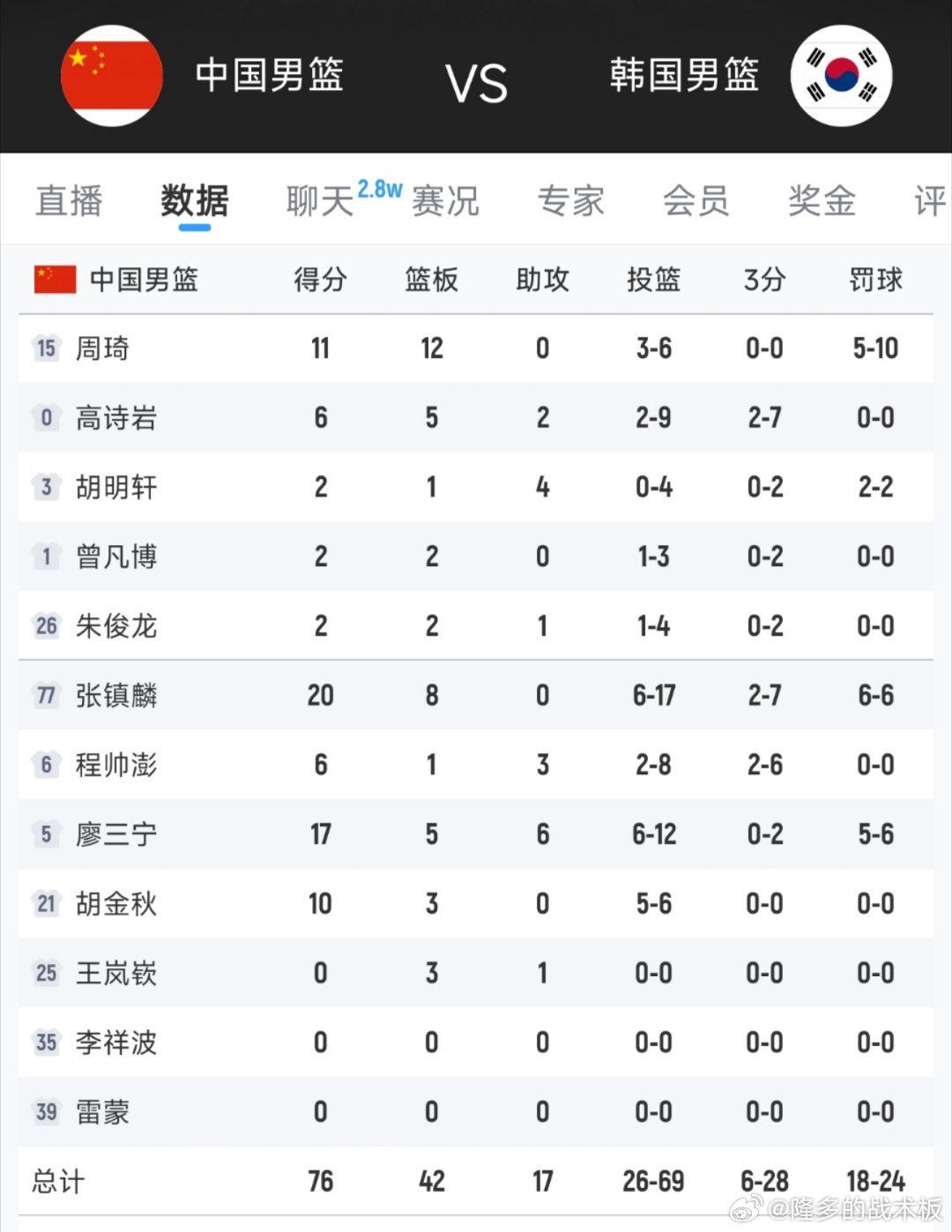 逆转失败,中国男篮世预赛首战76-80不敌韩国,遭遇开门黑。张镇麟20分8板,廖