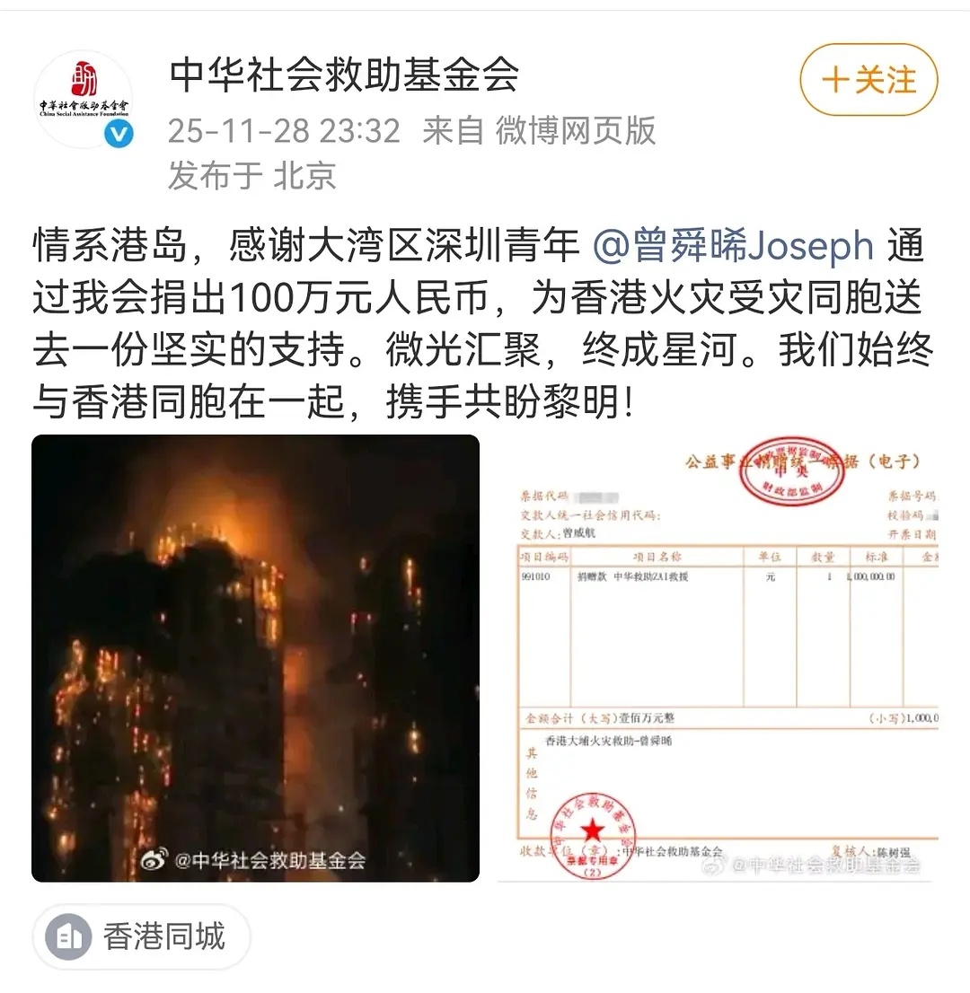 曾舜晞通过中华社会救助基金会向香港灾区捐出100w!有了爱的力量,我们终会度过难关!