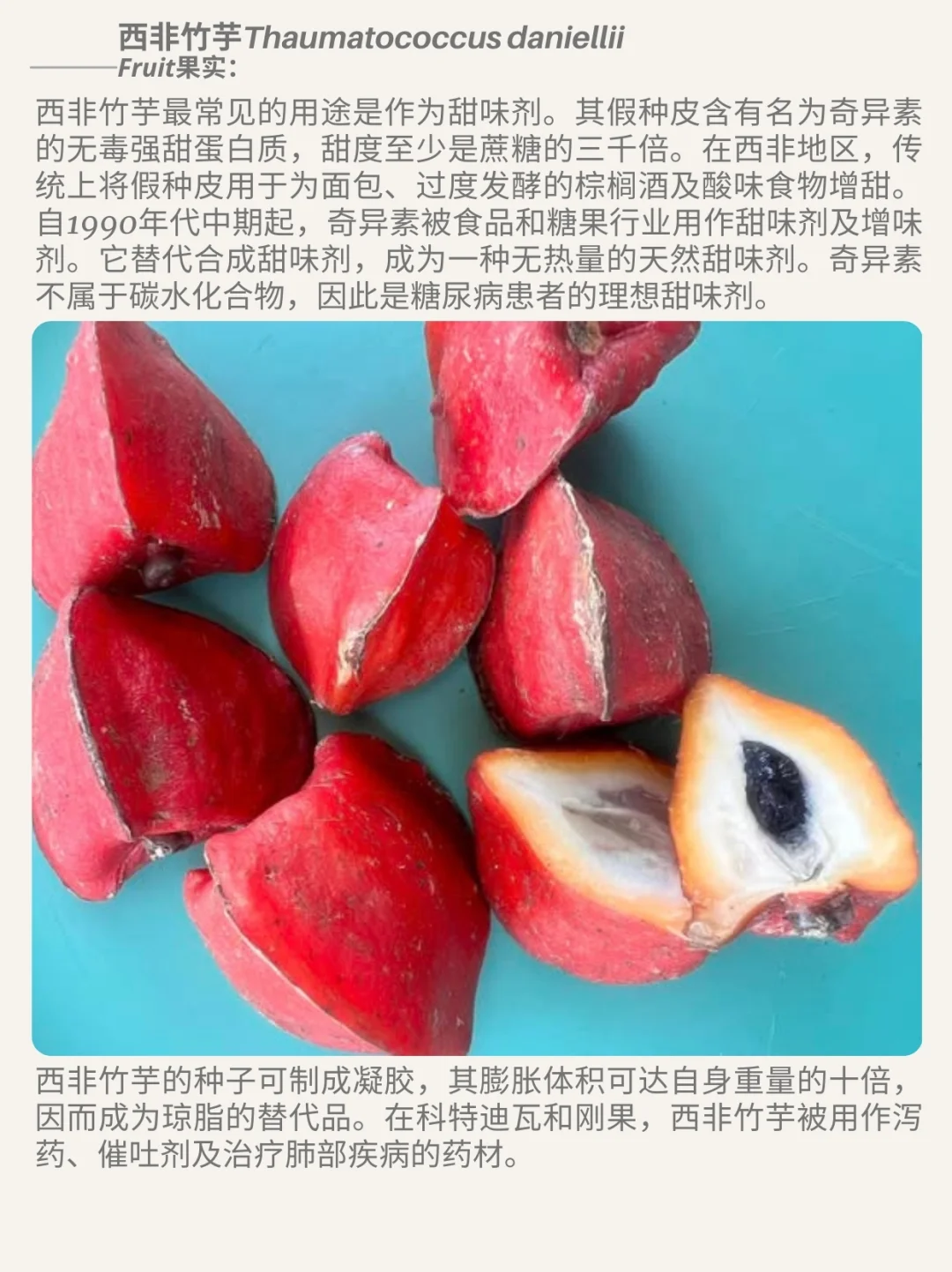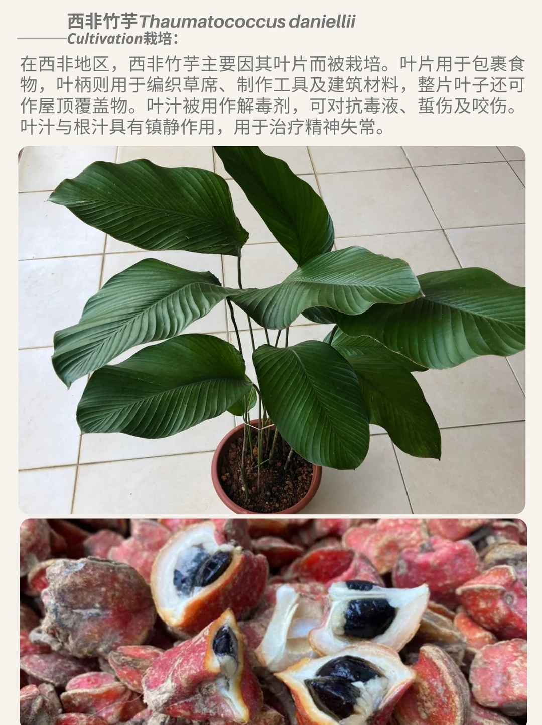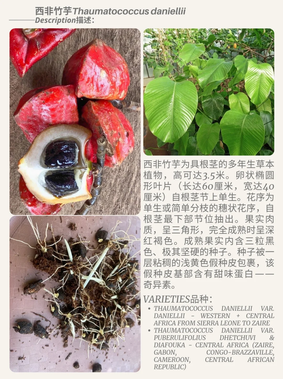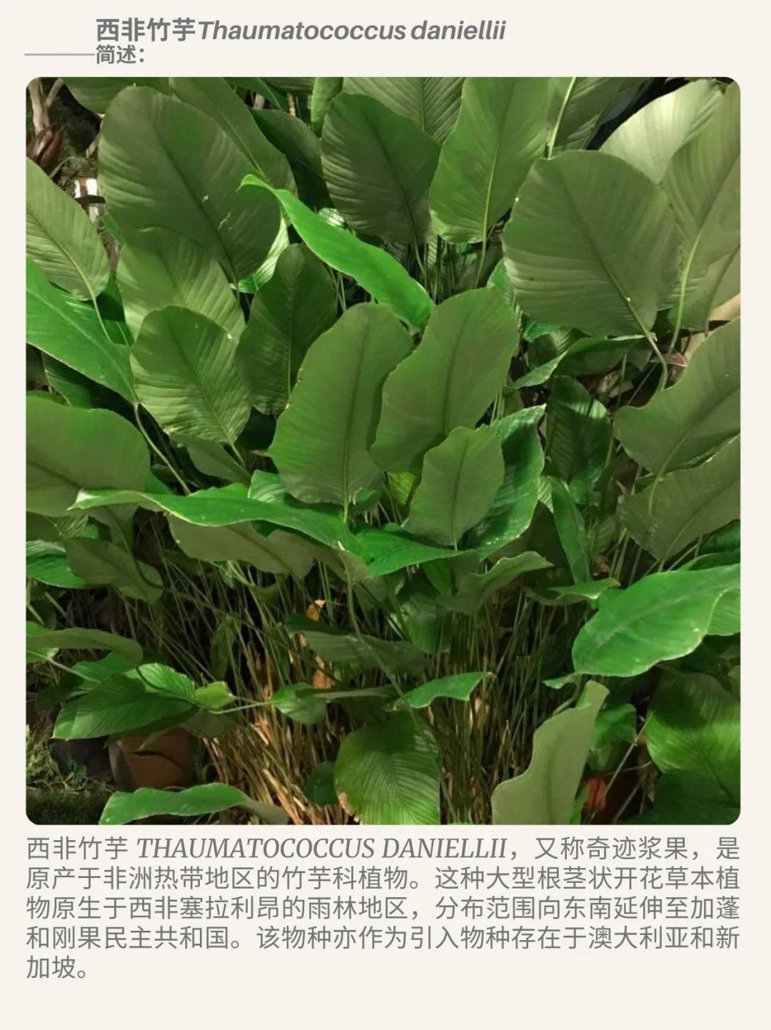 热带植物 西非竹芋 奇迹浆果 竹芋科 翅果竹芋属 西非 澳大利亚 水果 甜味剂 西非竹芋 Thaumatococcus daniellii,又称奇迹浆果,是原产于非洲热带地区的竹芋科Marantaceae翅果竹芋属Thaumatococcus植物。这种大型根茎状开花草本植物原生于西非塞拉利昂的雨林地区,分布范围向东南延伸至加蓬和刚果民主共和国。该物种亦作为引入物种存在于澳大利亚和新加坡。