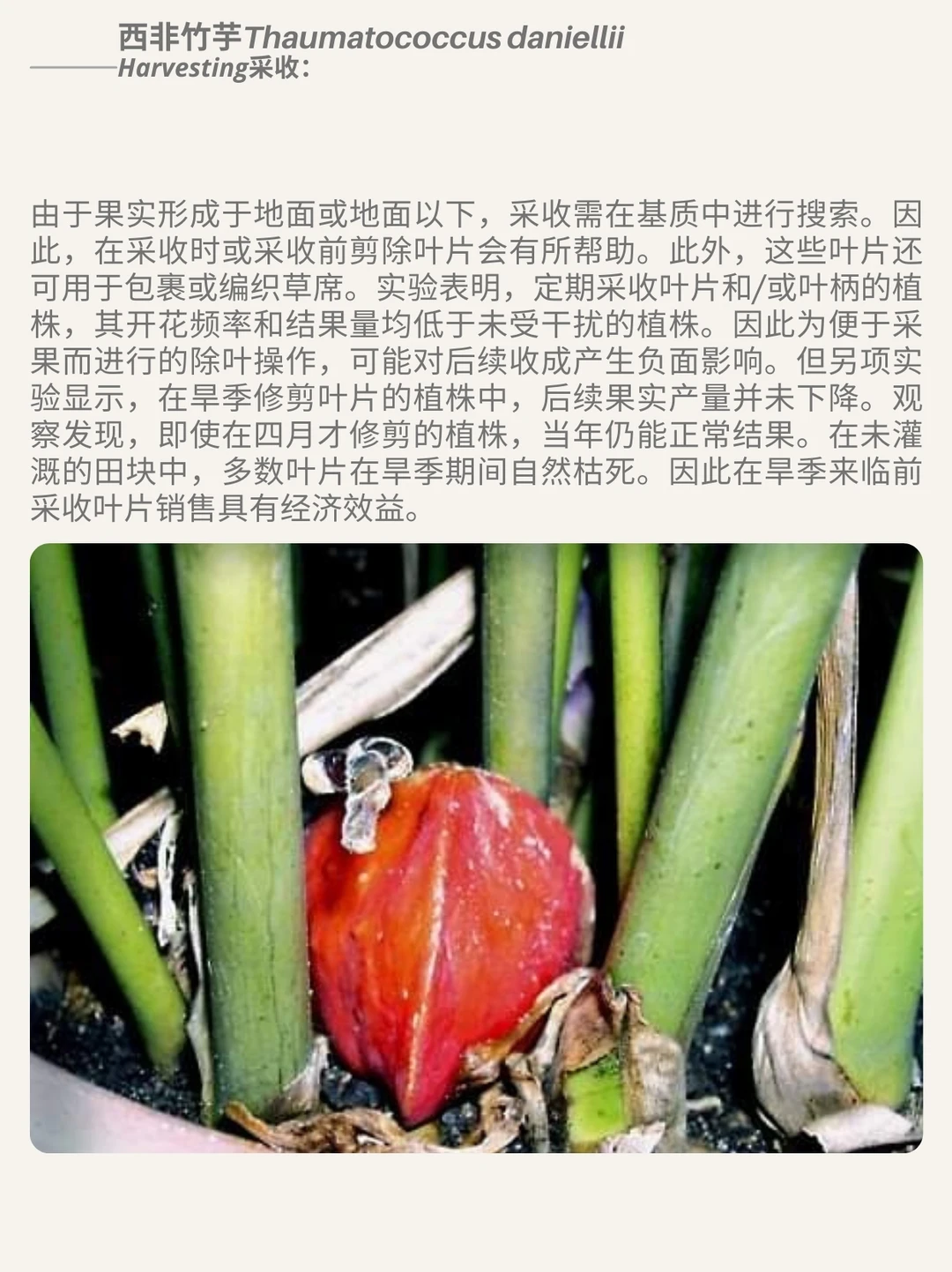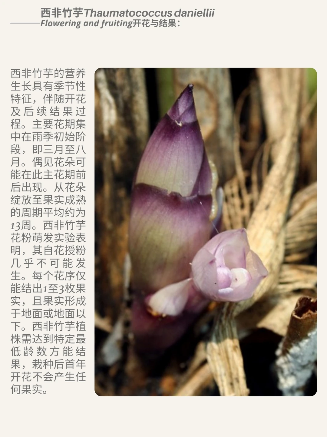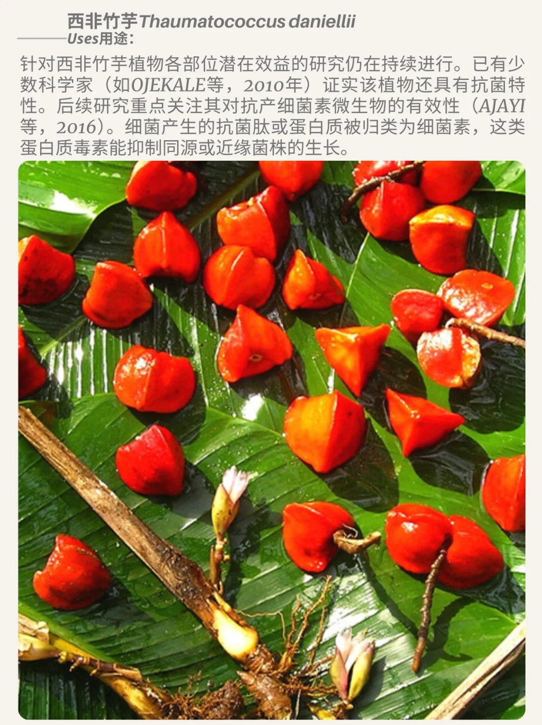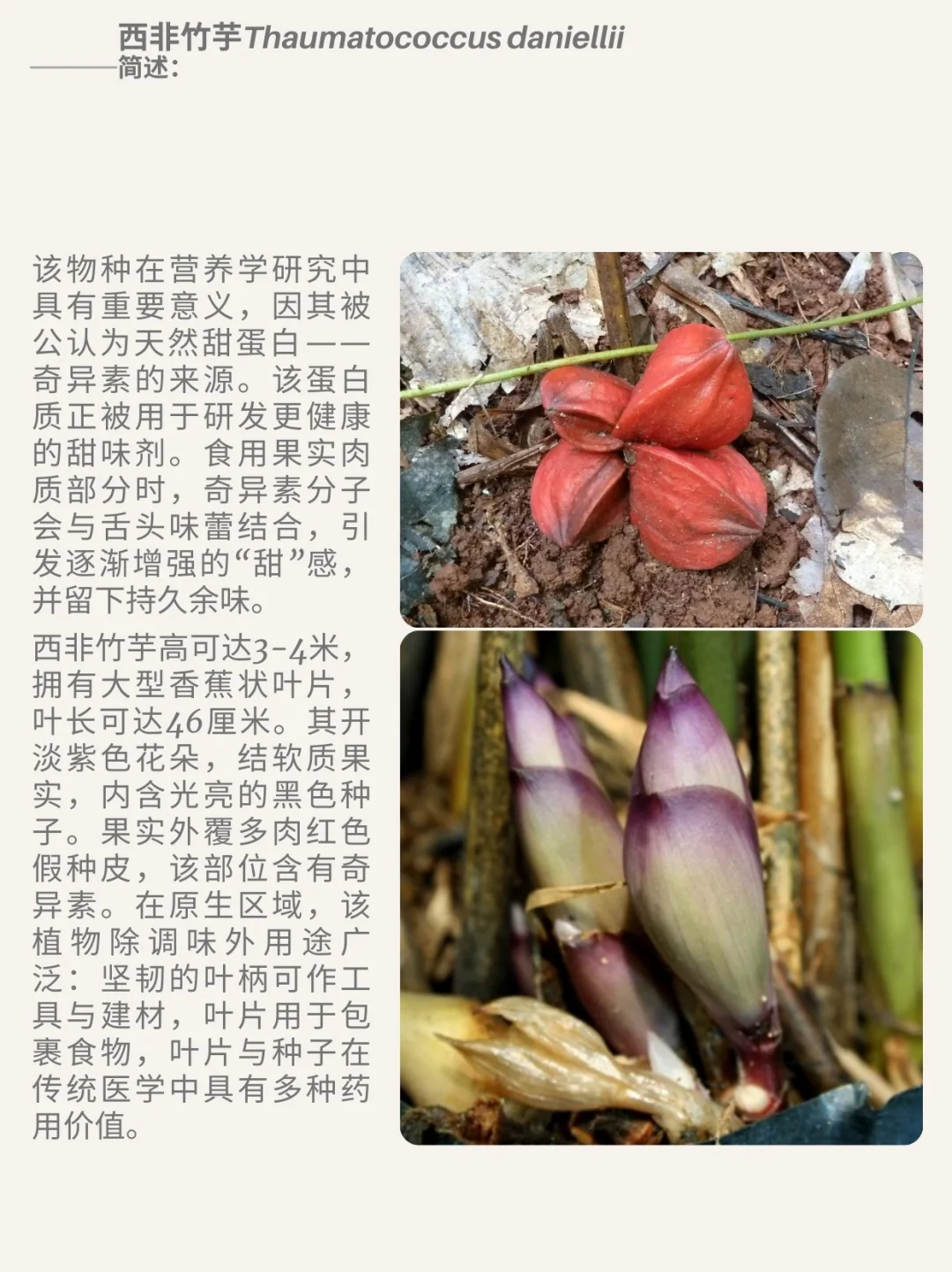 热带植物 西非竹芋 奇迹浆果 竹芋科 翅果竹芋属 西非 澳大利亚 水果 甜味剂 西非竹芋 Thaumatococcus daniellii,又称奇迹浆果,是原产于非洲热带地区的竹芋科Marantaceae翅果竹芋属Thaumatococcus植物。这种大型根茎状开花草本植物原生于西非塞拉利昂的雨林地区,分布范围向东南延伸至加蓬和刚果民主共和国。该物种亦作为引入物种存在于澳大利亚和新加坡。