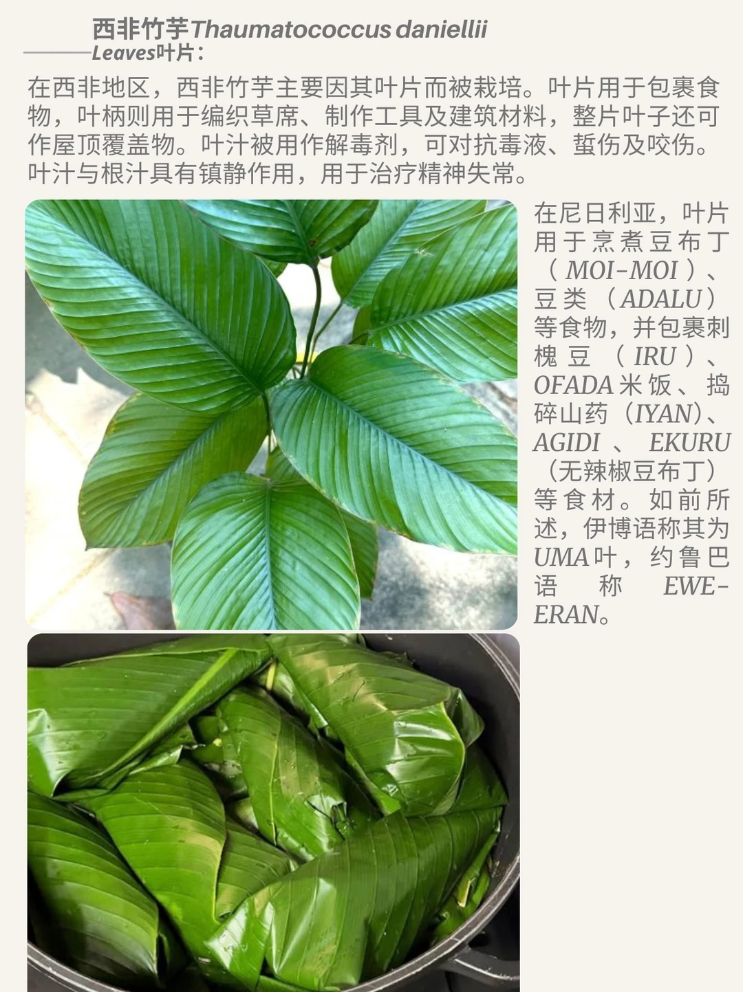 西非竹芋高可达3-4米,拥有大型香蕉状叶片,叶长可达46厘米。其开淡紫色花朵,结软质果实,内含光亮的黑色种子。果实外覆多肉红色假种皮,该部位含有奇异素。在原生区域,该植物除调味外用途广泛:坚韧的叶柄可作工具与建材,叶片用于包裹食物,叶片与种子在传统医学中具有多种药用价值。