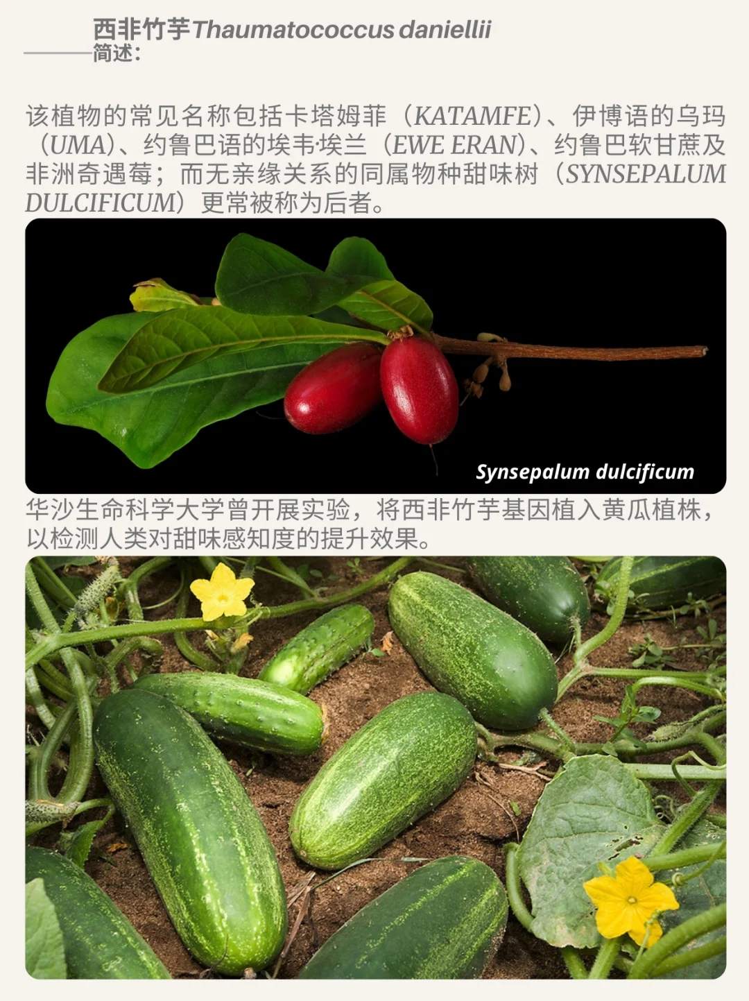 该物种在营养学研究中具有重要意义,因其被公认为天然甜蛋白——奇异素的来源。该蛋白质正被用于研发更健康的甜味剂。食用果实肉质部分时,奇异素分子会与舌头味蕾结合,引发逐渐增强的“甜”感,并留下持久余味。