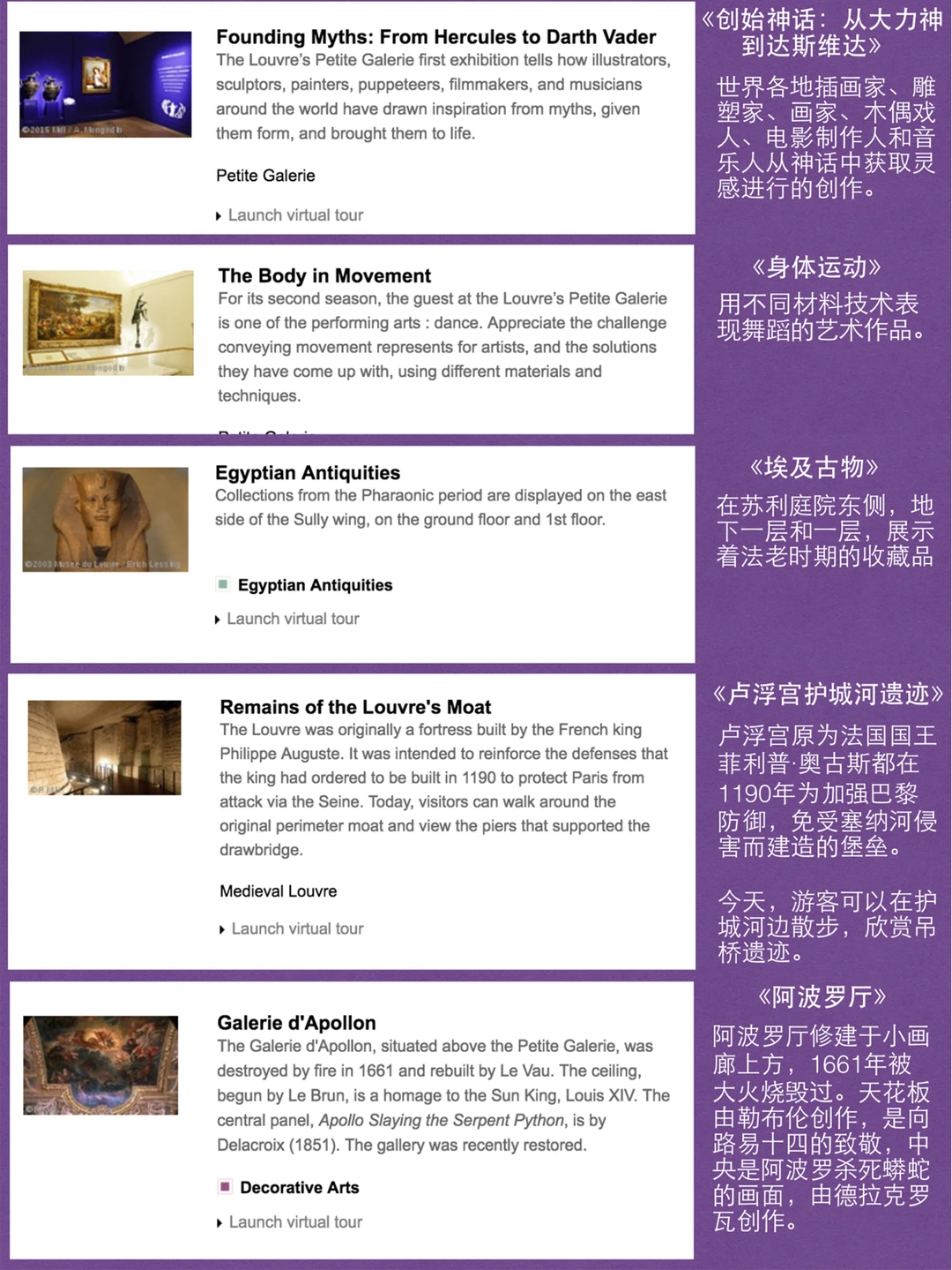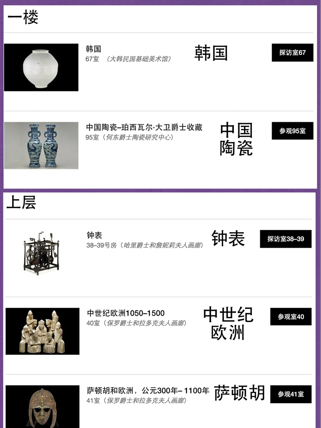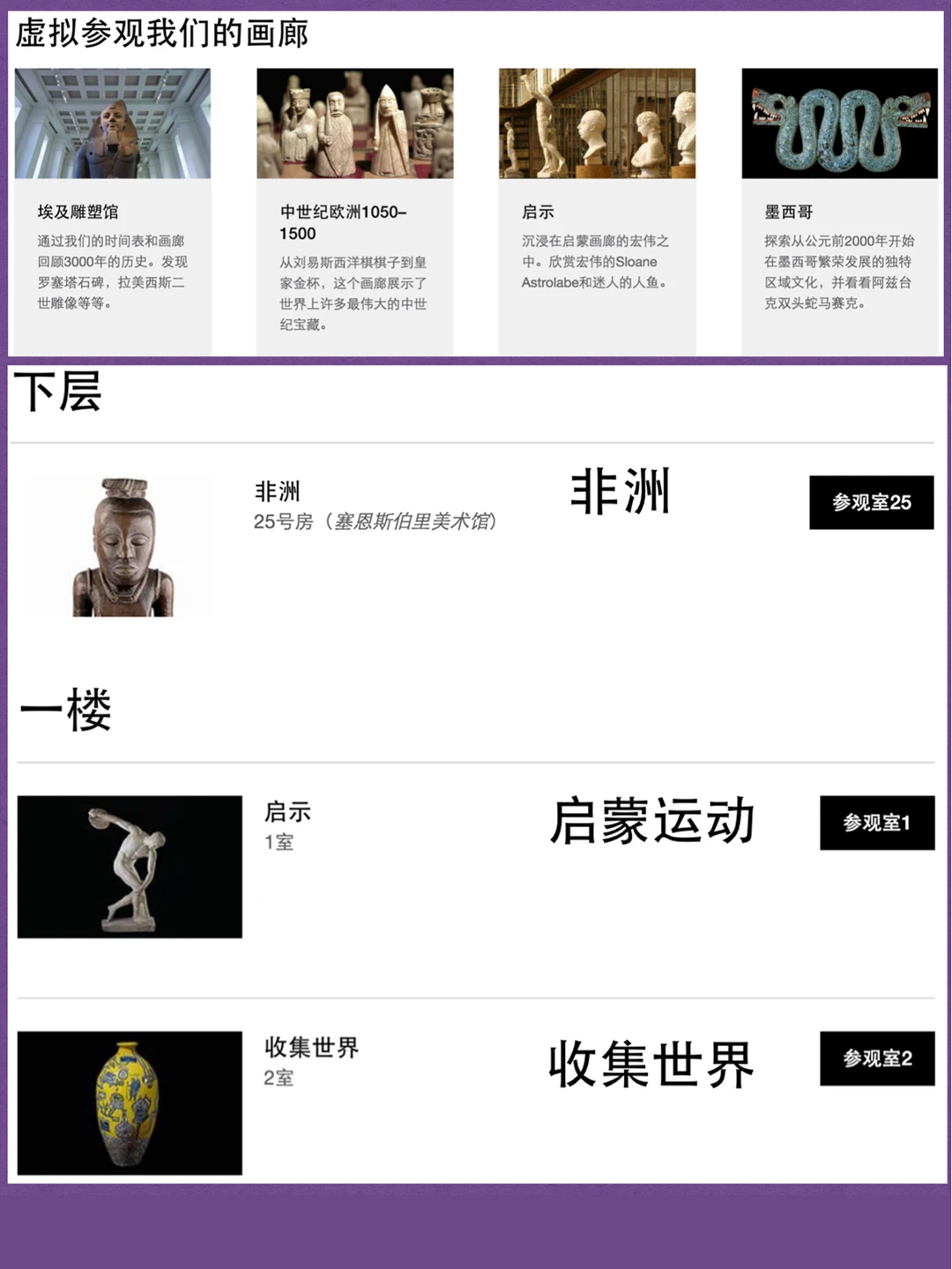 进入这个页面后,你将看到博物馆下层、一楼、上层包括非洲、埃及、古希腊罗马、中印、欧洲等61个室内展览。(见图345仅示一小部分)