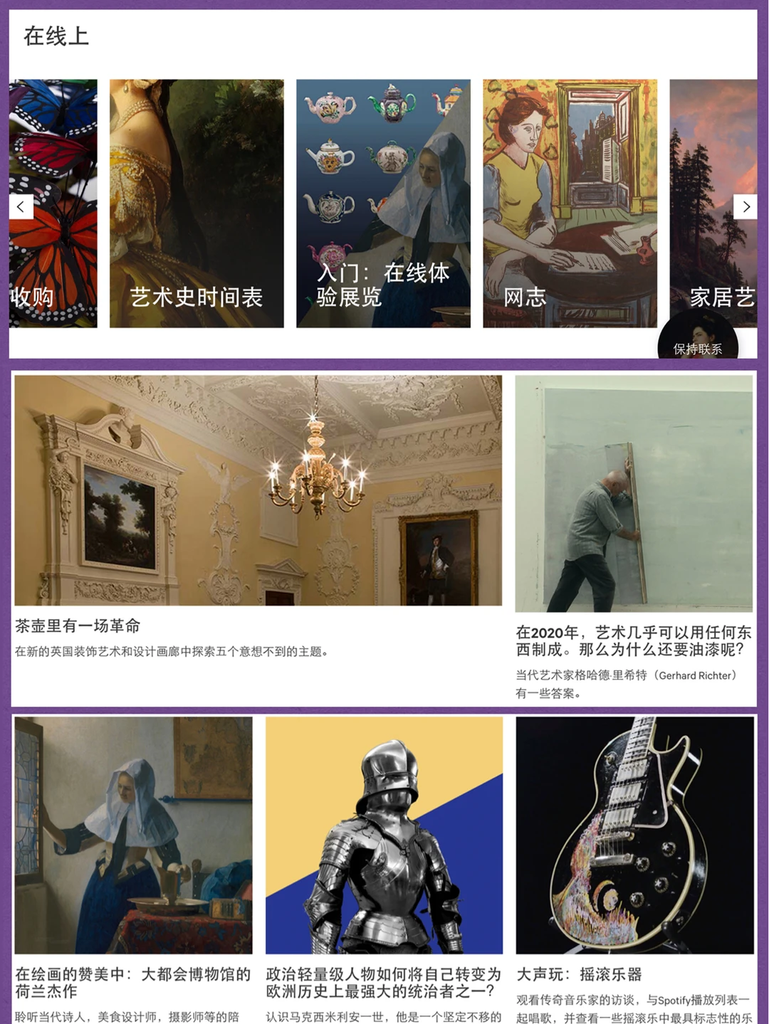不过我还是探索出一些可看性较高的内容。在首页有一个在线体验展览,里面有很多艺术主题。(见图8)