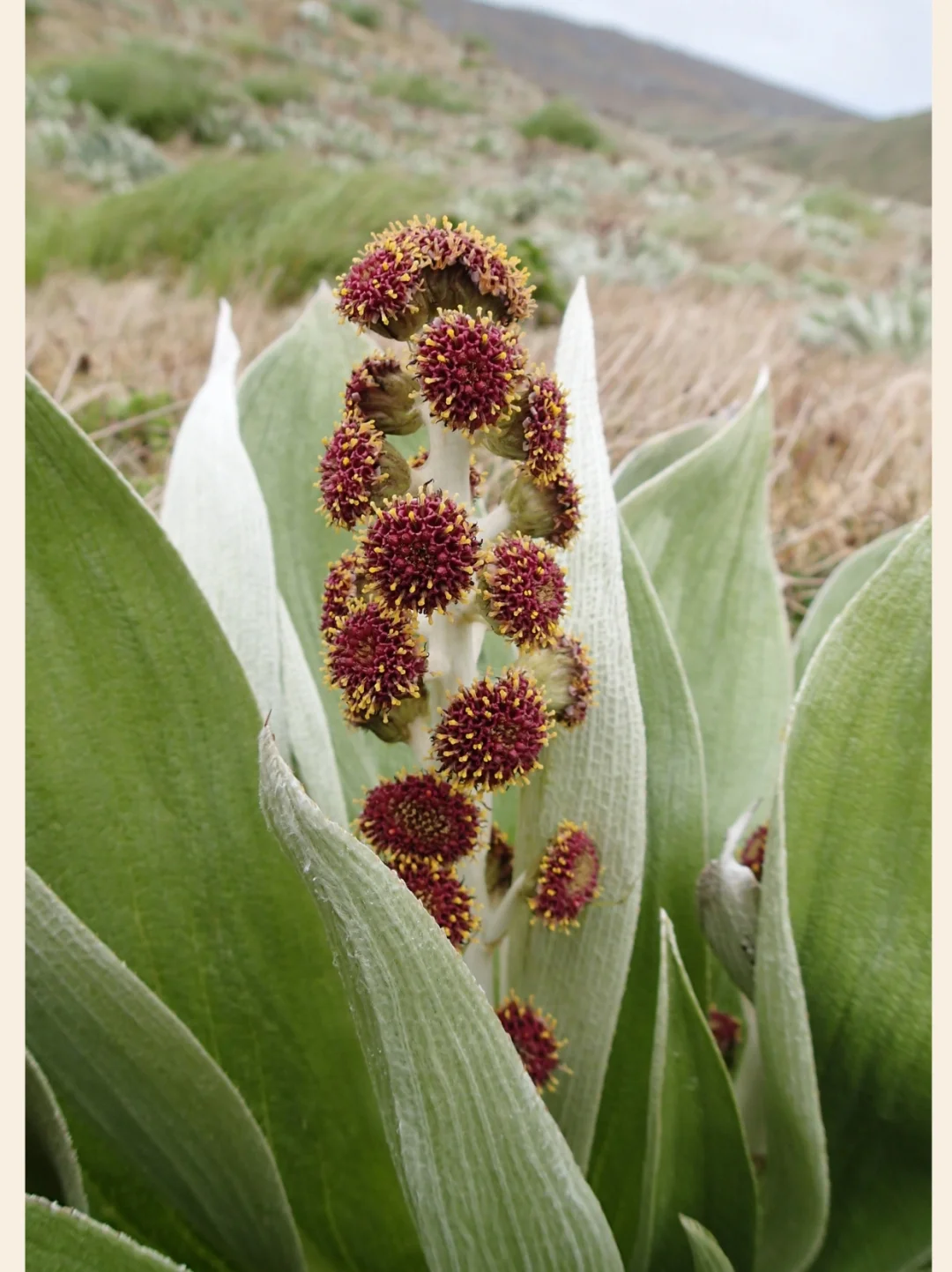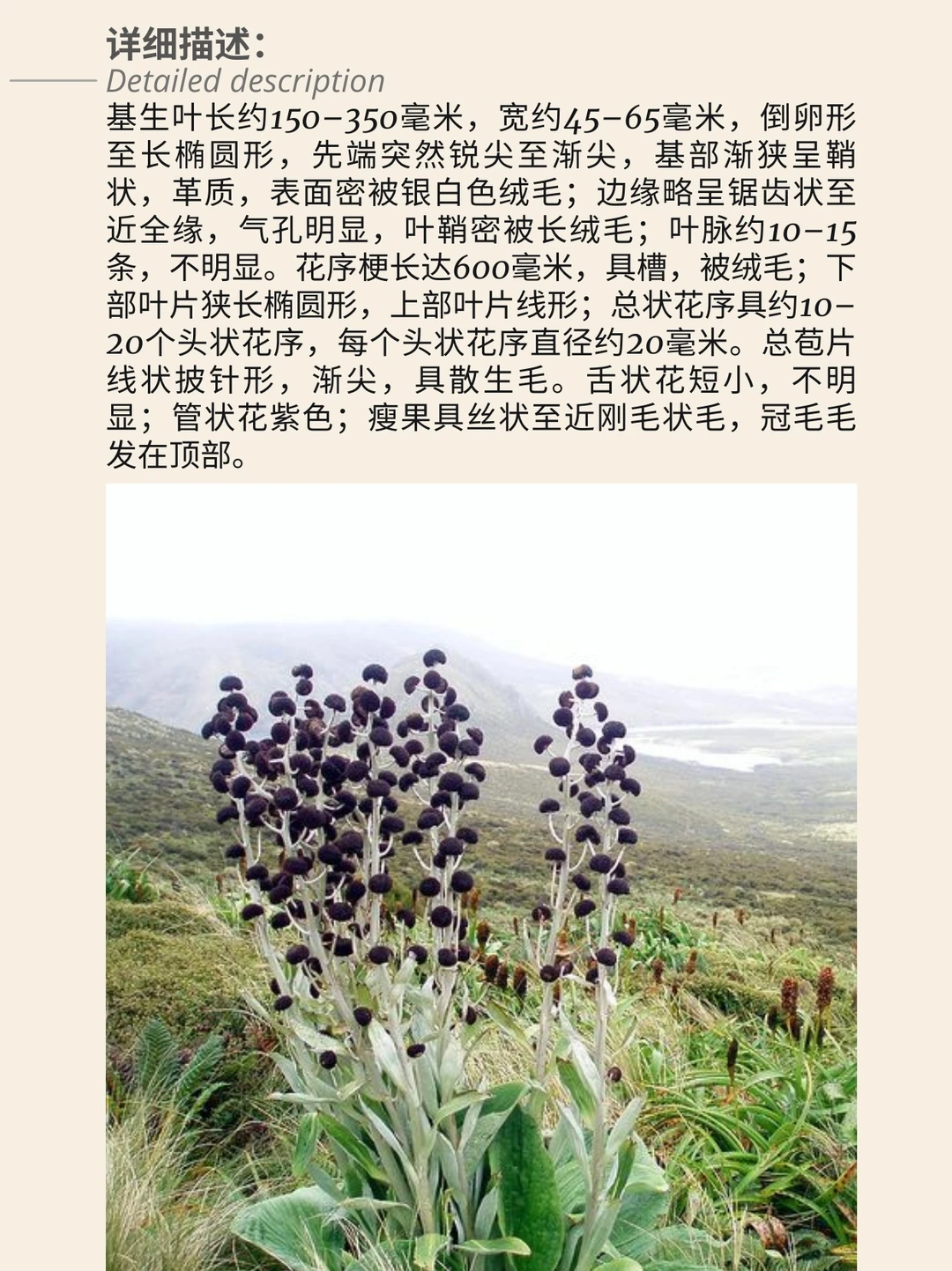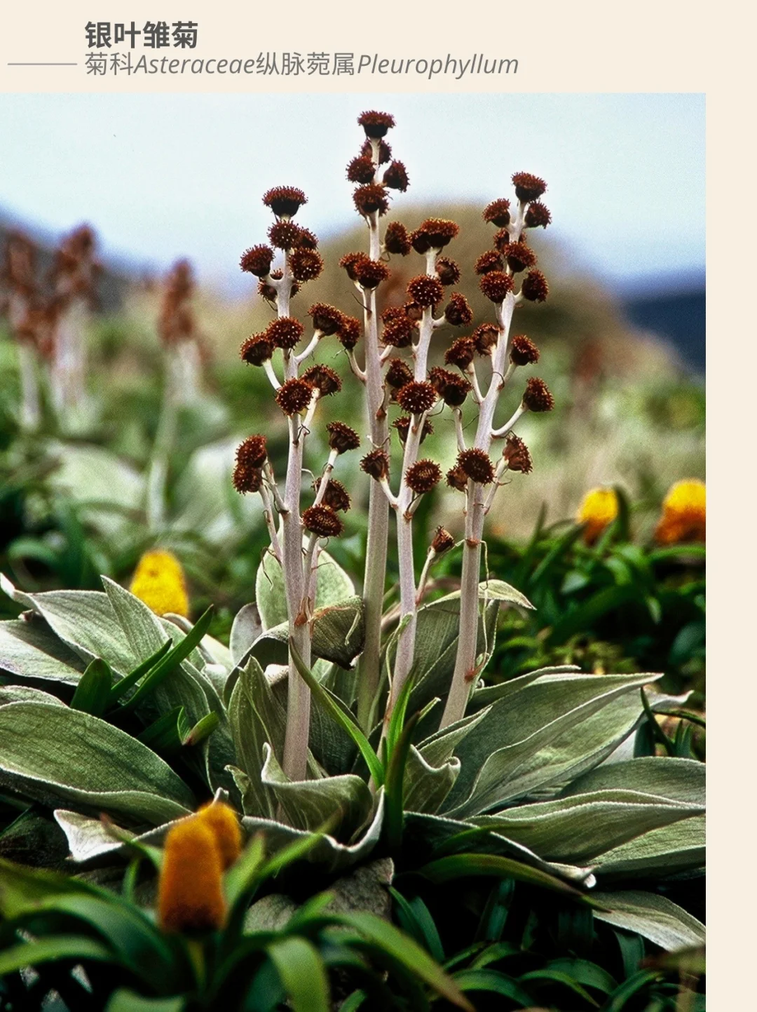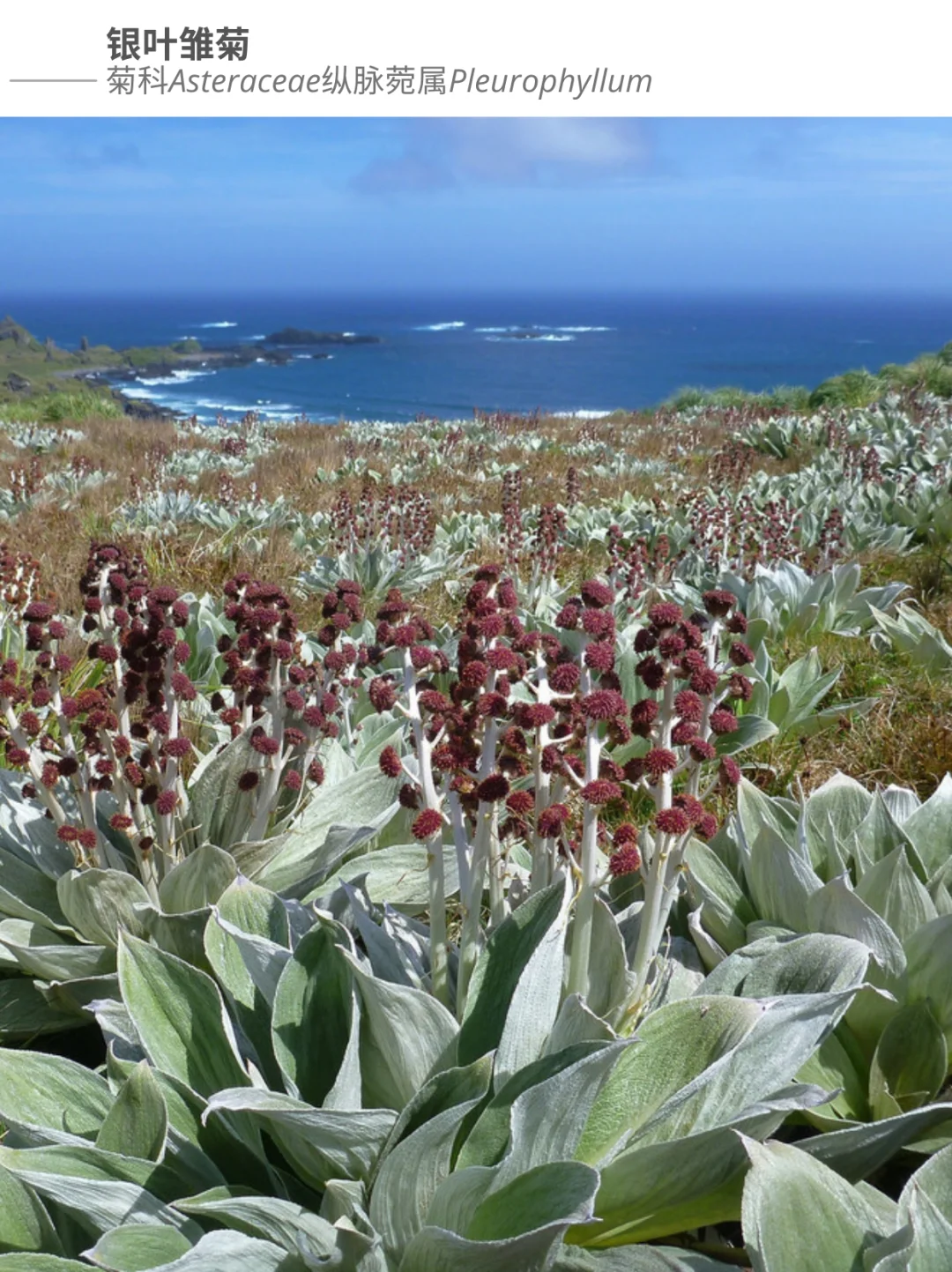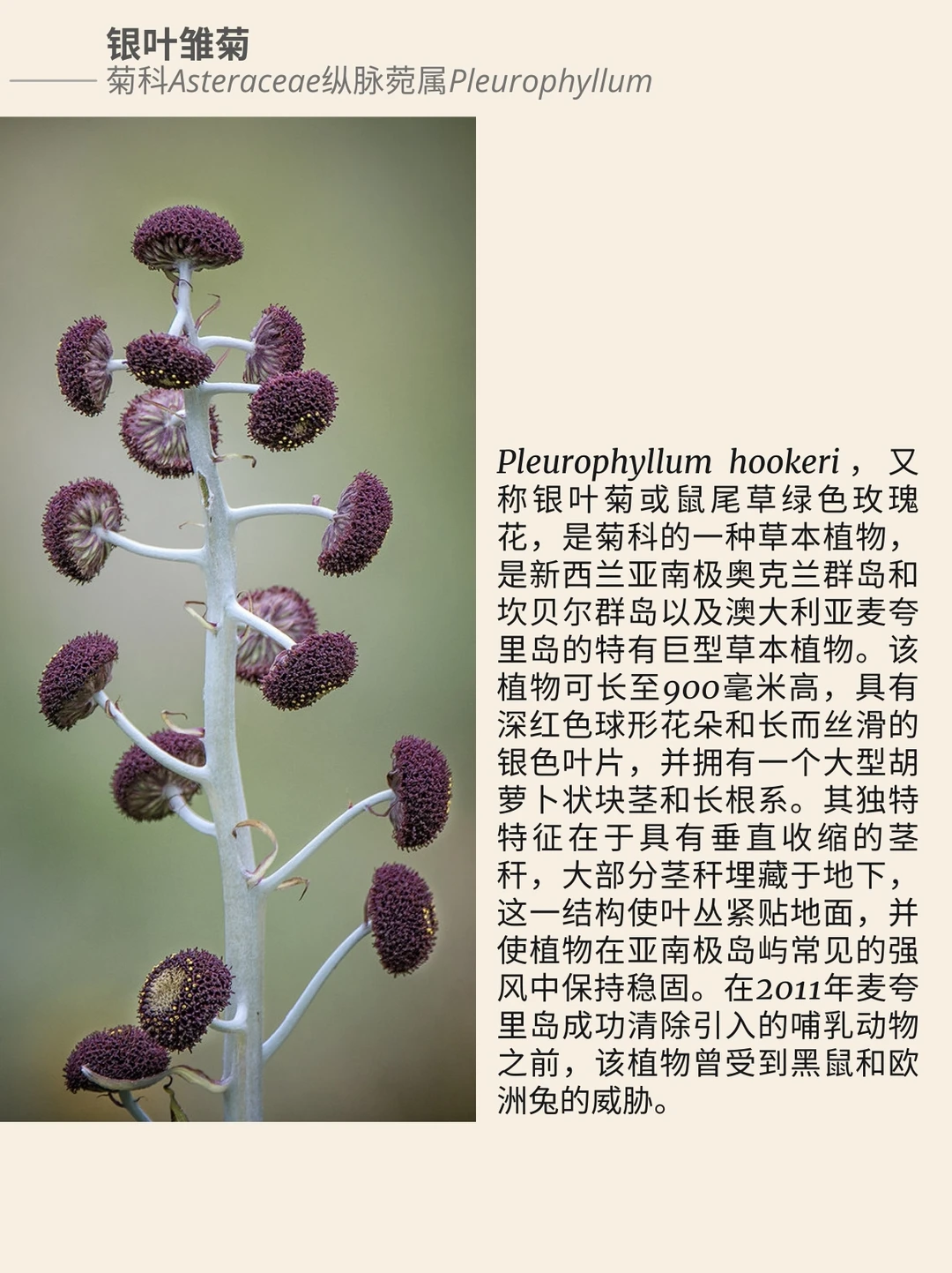 菊科  银叶雏菊  纵脉菀属  Pleurophyllum  新西兰  奥克兰群岛  澳大利亚麦夸里岛  山野草  巨型植物  银叶雏菊Pleurophyllum hookeri,菊科Asteraceae纵脉菀属Pleurophyllum。 Pleurophyllum hookeri,又称银叶菊或鼠尾草绿色玫瑰花,是菊科的一种草本植物,是新西兰亚南极奥克兰群岛和坎贝尔群岛以及澳大利亚麦夸里岛的特有巨型草本植物。该植物可长至900毫米高,具有深红色球形花朵和长而丝滑的银色叶片,并拥有一个大型胡萝卜状块茎和长根系。其独特特征在于具有垂直收缩的茎秆,大部分茎秆埋藏于地下,这一结构使叶丛紧贴地面,并使植物在亚南极岛屿常见的强风中保持稳固。在2011年麦夸里岛成功清除引入的哺乳动物之前,该植物曾受到黑鼠和欧洲兔的威胁。 基生叶长约150–350毫米,宽约45–65毫米,倒卵形至长椭圆形,先端突然锐尖至渐尖,基部渐狭呈鞘状,革质,表面密被银白色绒毛;边缘略呈锯齿状至近全缘,气孔明显,叶鞘密被长绒毛;叶脉约10–15条,不明显。花序梗长达600毫米,具槽,被绒毛;下部叶片狭长椭圆形,上部叶片线形;总状花序具约10–20个头状花序,每个头状花序直径约20毫米。总苞片线状披针形,渐尖,具散生毛。舌状花短小,不明显;管状花紫色;瘦果具丝状至近刚毛状毛,冠毛毛发在顶部。