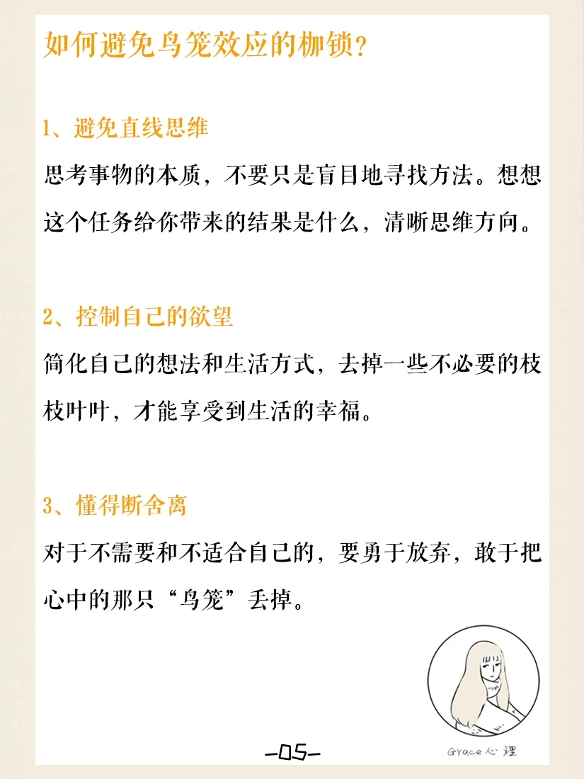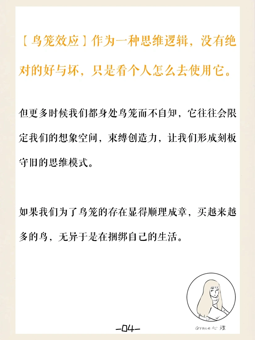 ▪️“鸟笼效应”作为一种思维逻辑,没有绝对的好与坏,只是看个人怎么去使用它。但更多时候我们都身处鸟笼而不自知,它往往会限定我们的想象空间,束缚创造力,让我们形成刻板守旧的思维模式,从而为了鸟笼的存在显得顺理成章,买越来越多的鸟,无异于在捆绑自己的生活。