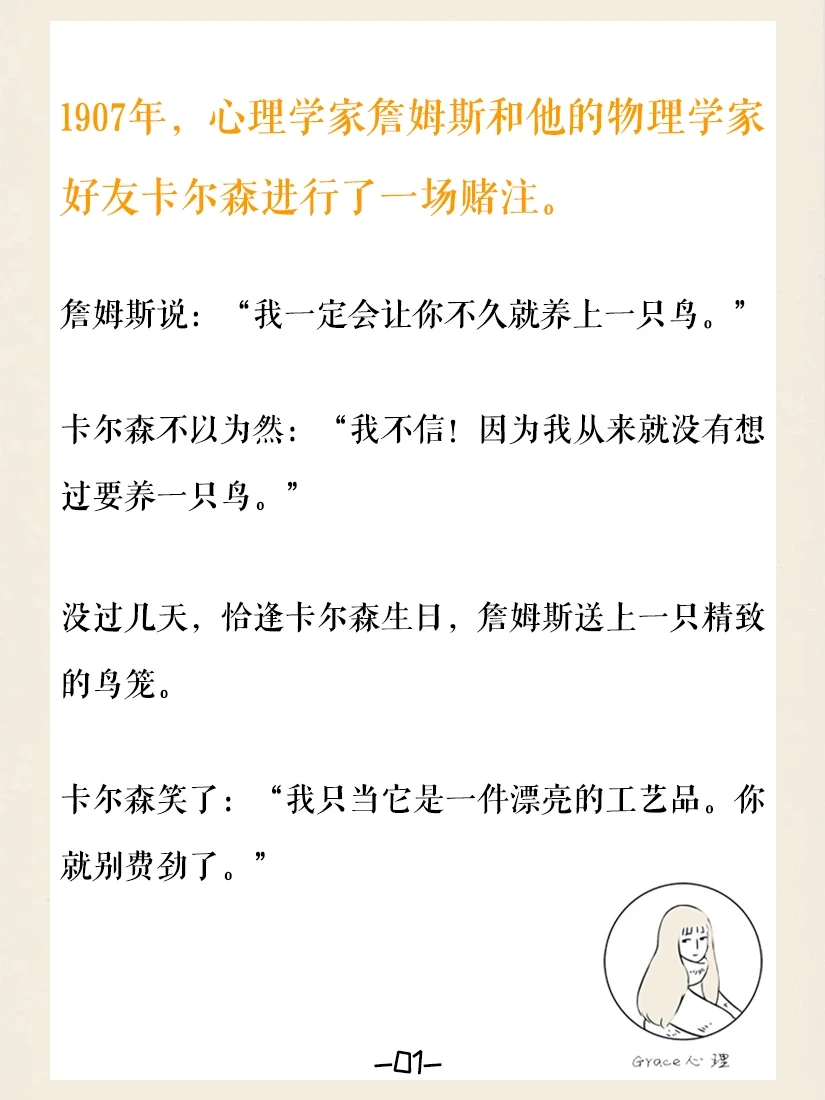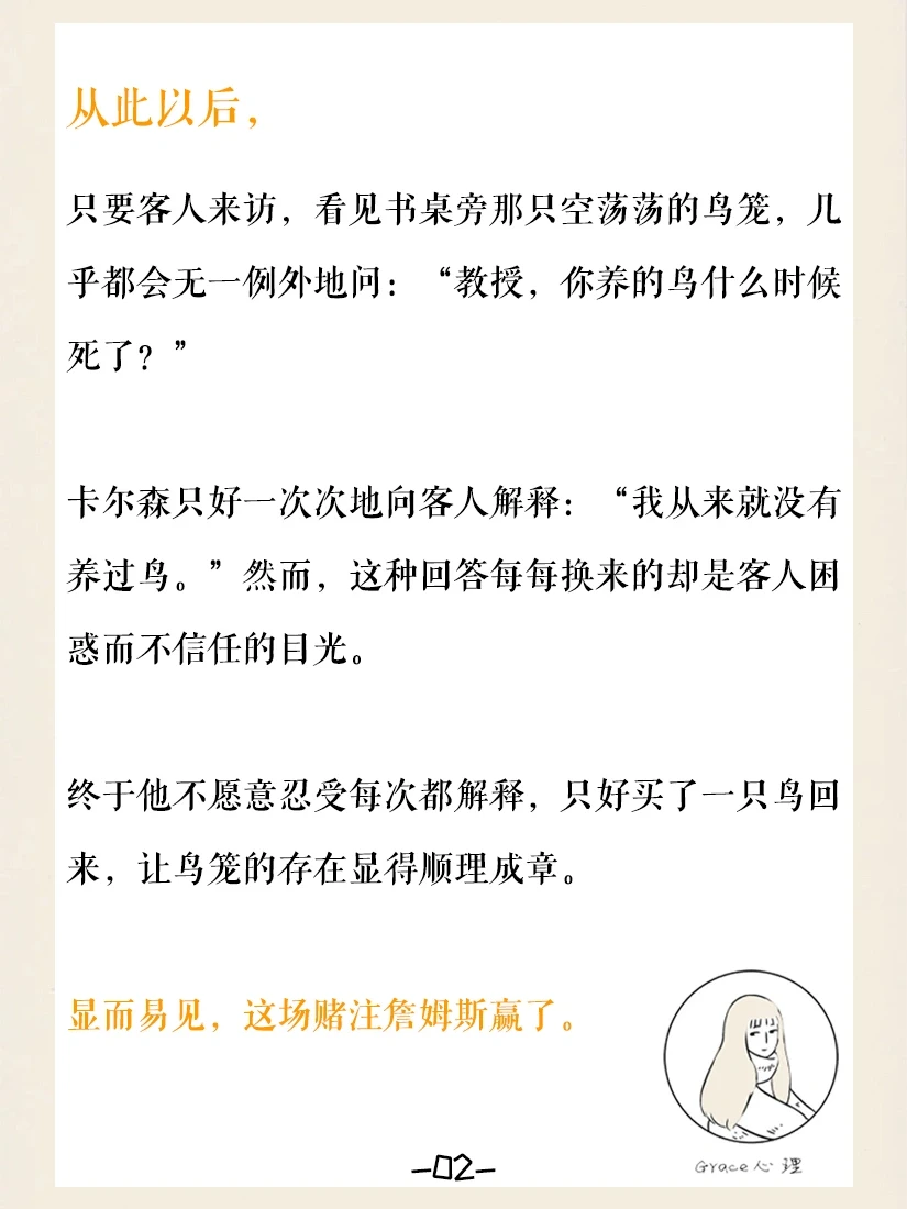 ▪️从此以后,只要客人来访,看见书桌旁那只空荡荡的鸟笼,几乎都会无一例外地问:“教授,你养的鸟什么时候死了?”卡尔森只好一次次地向客人解释:“我从来就没有养过鸟。”然而,这种回答每每换来的却是客人困惑而不信任的目光。终于他不愿意忍受每次都解释,只好买了一只鸟回来,让鸟笼的存在显得顺理成章。显而易见,这场赌注詹姆斯赢了。