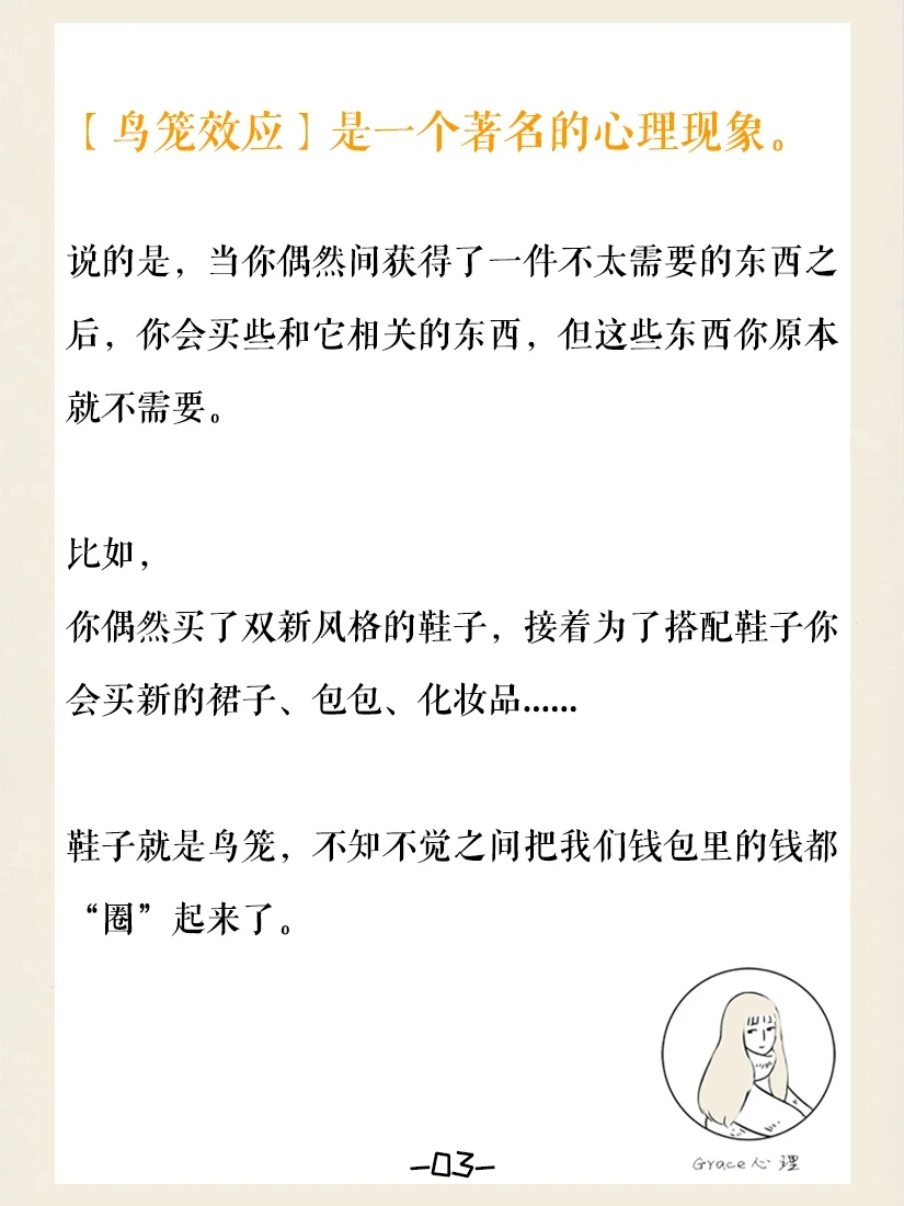 🔹【鸟笼效应】是一个著名的心理现象。说的是,当你偶然间获得了一件不太需要的东西之后,你会买些和它相关的东西,但这些东西你原本就不需要。比如你偶然买了一双新风格的鞋子,接着为了搭配鞋子你会买新的裙子、包包、化妆品......鞋子就是鸟笼,不知不觉把我们钱包里的钱都“圈”起来了。