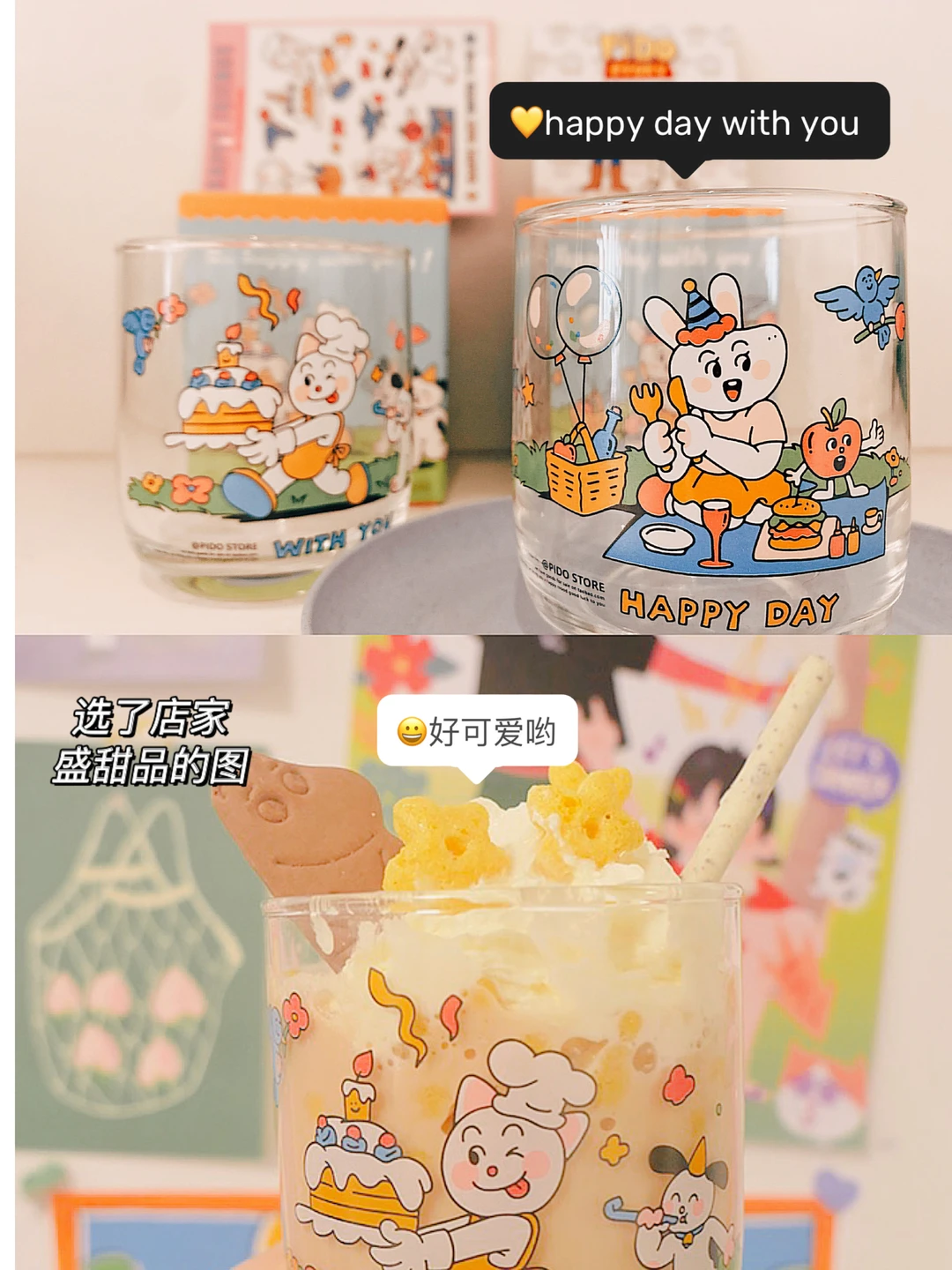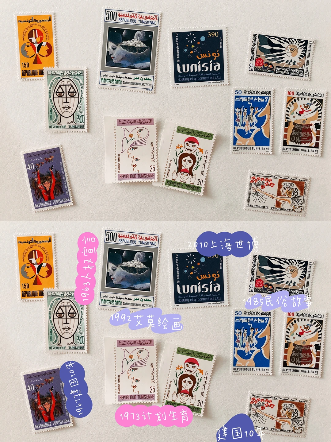 [喝奶茶R] 在种草的对杯,印着happy day with you的字样,一杯是🐰野餐,一杯是🐱过生日,看得太开心啦!而且包装和赠送贴纸都超可爱,最近喝咖啡喝🥂喝水都离不开它,感觉每天都充满元气💪! - [飞吻R] 突尼斯邮票是被B站up主竹子种草的,每一枚的意义都被我标在图上啦。它们有的充满童趣,有的饱含艺术,怎么看怎么喜欢😘!