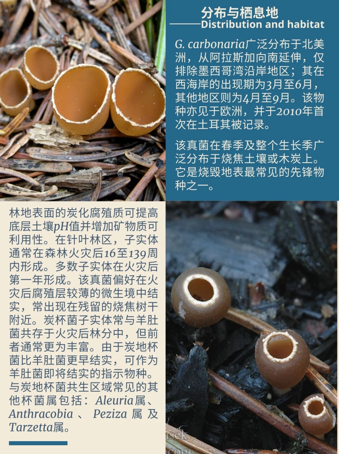 该真菌广泛分布于北半球众多温带地区,可见于欧洲、土耳其及北美洲。子实体常见于灌木丛新近焚烧后的土壤中,有时数量极为庞大。虽然它主要作为腐生菌种,以火灾后残留的腐烂有机物为食,但也与挪威云杉根系形成生物共生关系。