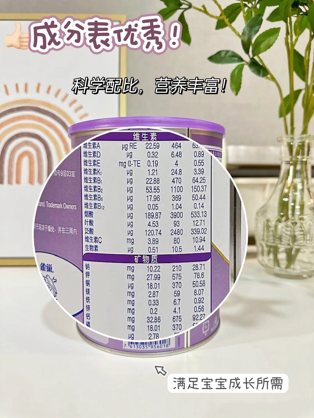 ✔除此之外,钙、铁、锌、DHA、维生素C等元素全都有,配比科学,营养到位,压根不落后于正常宝宝喝的奶粉!