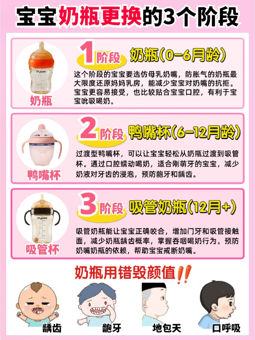💁♀️因为不同阶段的宝宝,它的咬合和吞咽能力是不同的,我们必须根据宝宝的成长规律选择适配的奶瓶,不分阶段使用奶瓶会增加奶瓶龋齿的风险,影响宝宝语言发育、进食和颌面部发育,影响宝宝颜值,增加肥胖风险!