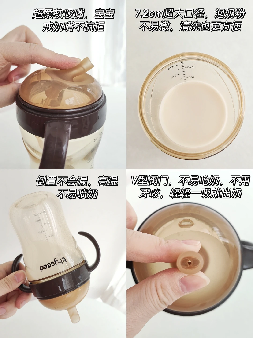 ✔️它的吸嘴是V型防呛阀设计的,防喷防漏,且不用牙咬就可以出奶,喝奶很轻松,双手柄设计,宝宝抓握更方便,增加宝宝自主喝奶自信!