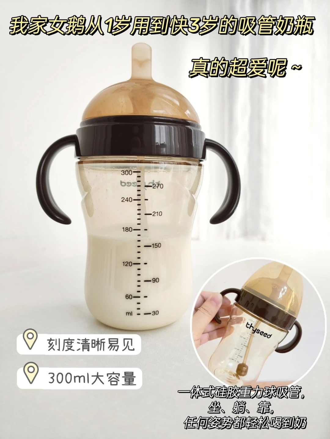 ✔️瓶身ppsu材质,耐磨耐摔耐高温,300毫升大容量,从1岁用到3岁妥妥的!并且它的一体式硅胶重力球吸管设计超棒,任意角度宝宝都可以喝到奶,拆卸安装也很方便!