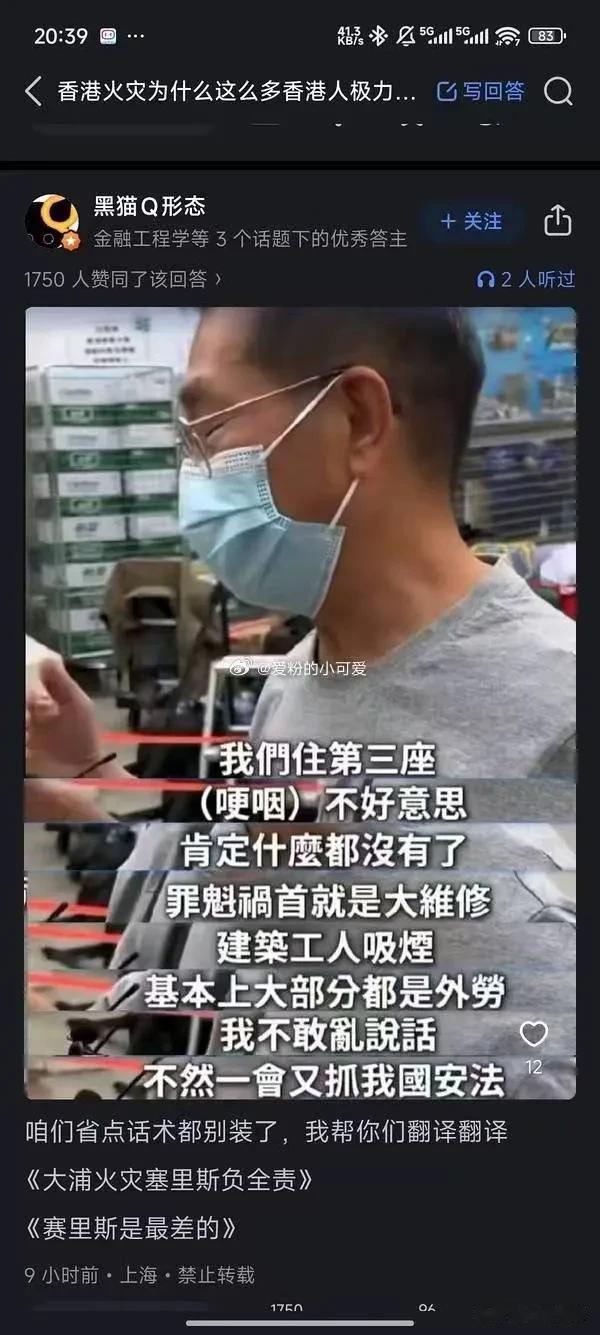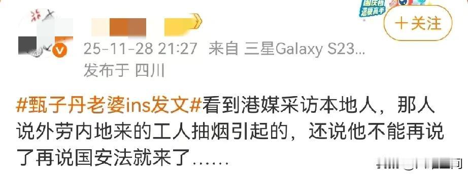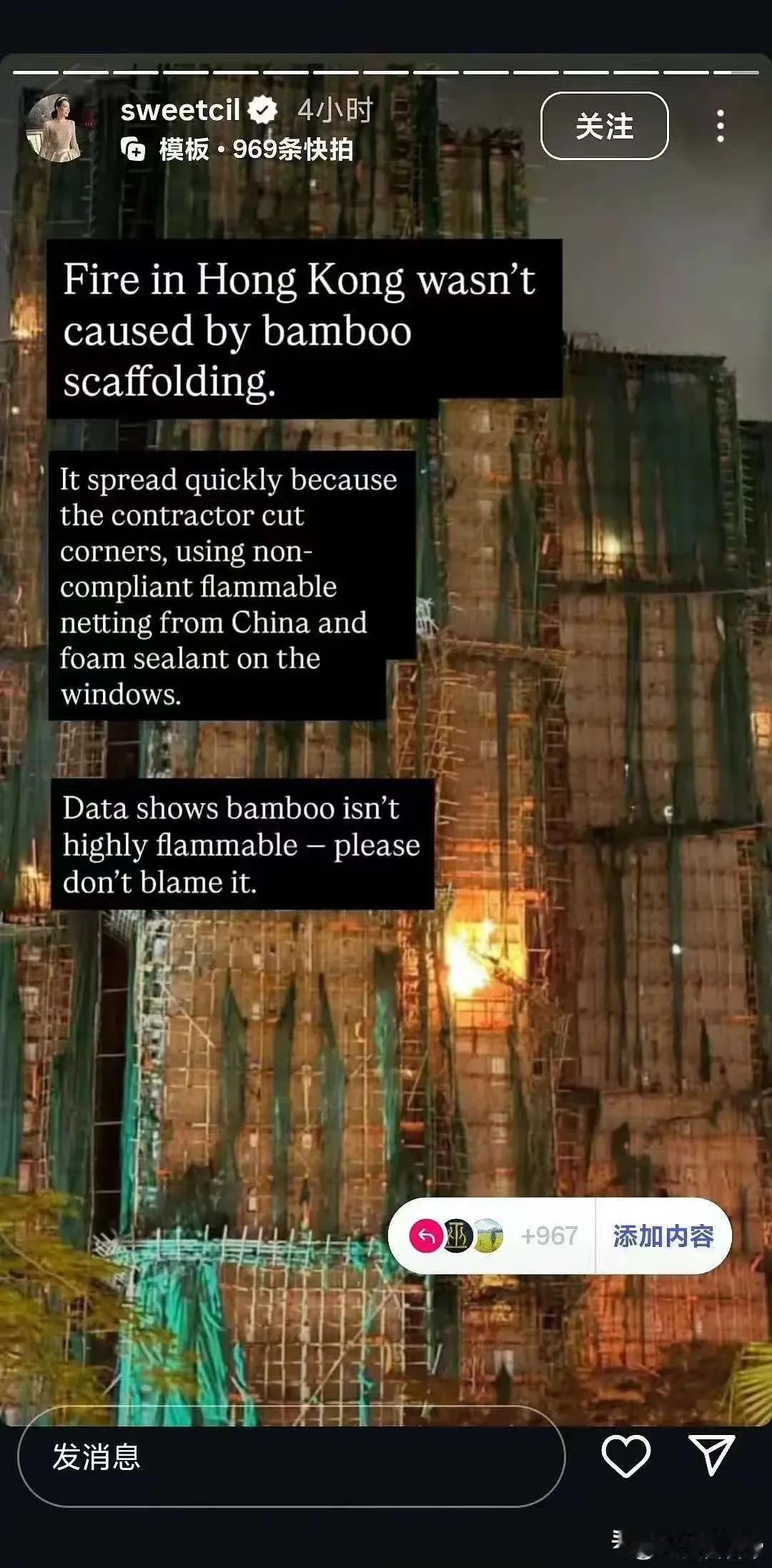 这是香港甄子丹老婆在外网发的帖子,最终锅还是内地背下了,大火刚开始,然后说到这个竹子脚手架的争论,我就有预感,那边的人会把这个锅扣在内地头上,这不甄子丹老婆就发这种帖子了,还有很多本地人说事内地过去的劳工抽烟,实际内地过去的劳工受到雇主的严格管理,不仅不能抽烟,头盔也必须带,要不然就被炒鱿鱼了,而抽烟的多是本地的工人!