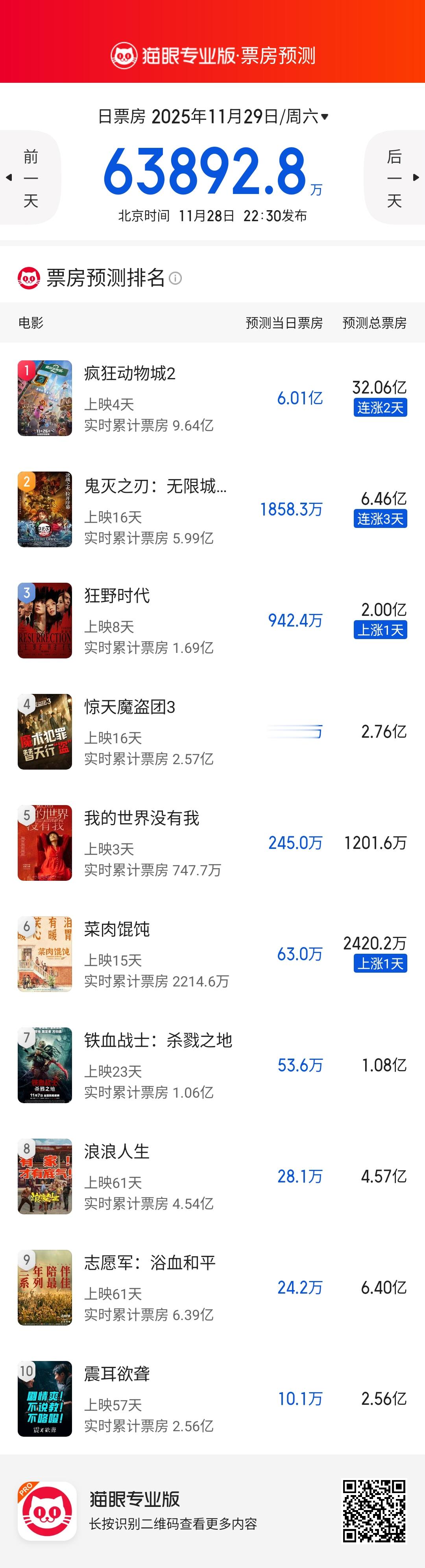 疯狂动物城2 单片扛起市场,明天将挑战日票房6亿,总预测票房来到了30亿+,太炸裂了!基本上只有春节档的电影单日才有机会达到这个级别了。