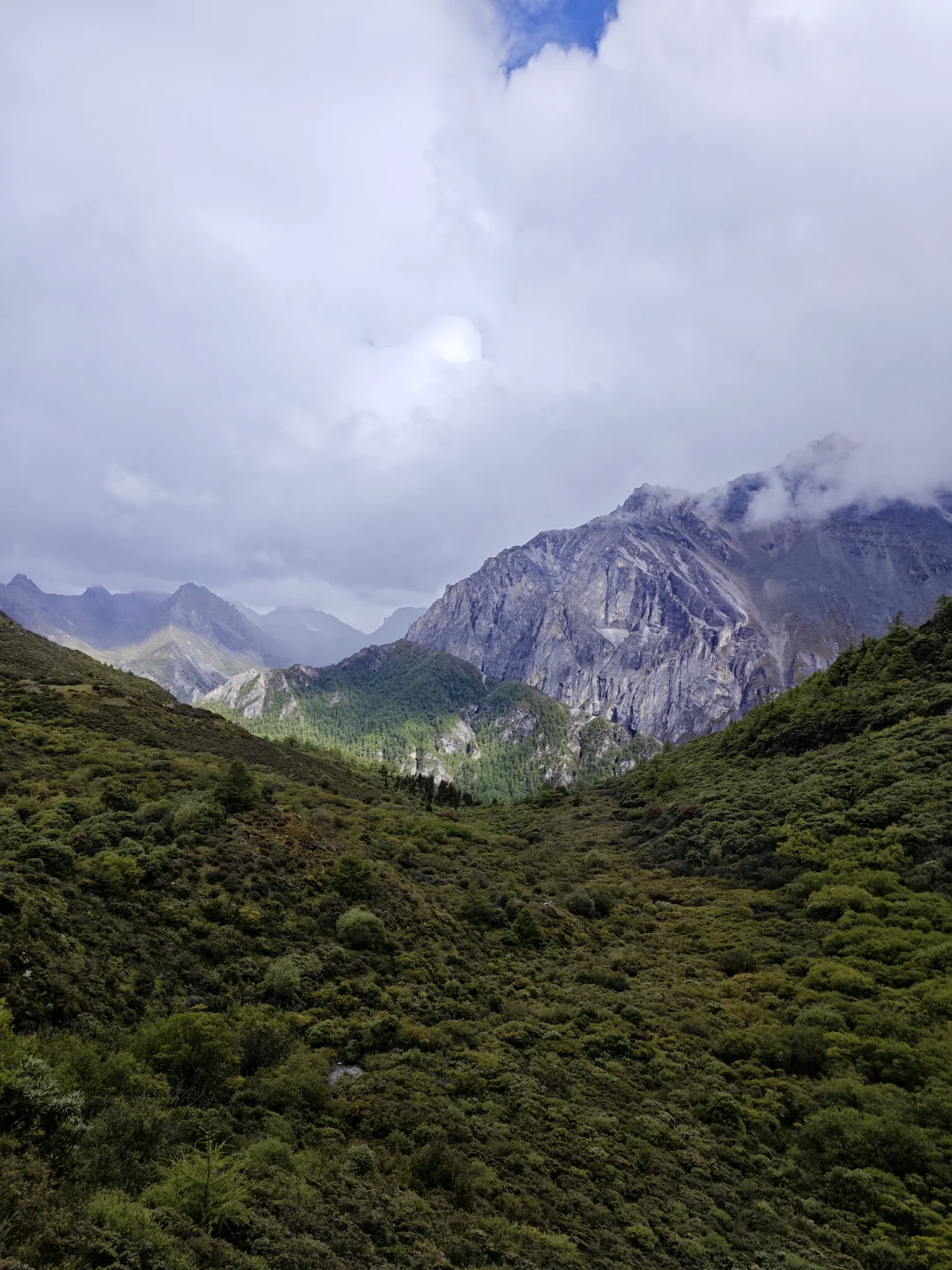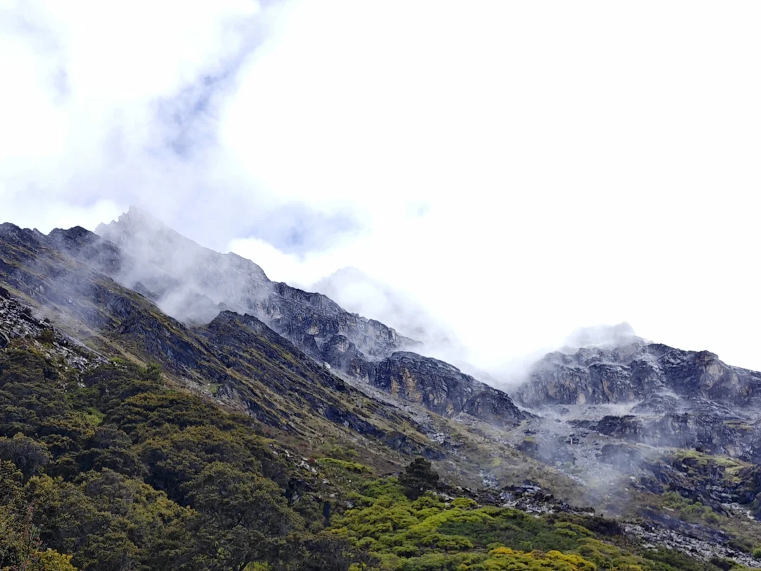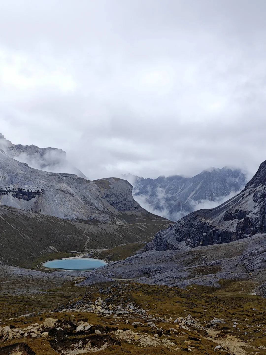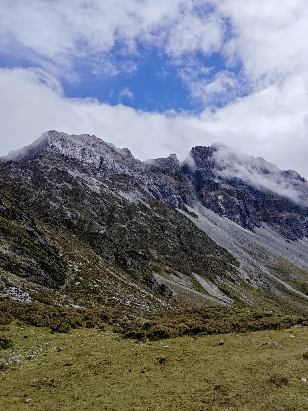 ⭐基本参数 ❶路线:亚丁大转山D5行程 ❷行程:蛇湖营地4500m→松多垭口4660m→卡斯牛场4460m→牧屋4320m→松洛垭口4675m→景区栈道4150m→扎灌崩3950m ❸起点:蛇湖垭口 ❹终点:亚丁扎灌崩 ❺至低海拔:3950m ❻至高海拔:4692m ❼累计里程:15.1Km ❽累计爬升:632m ❾累计下降:1160m ❿全程耗时:8小时13分钟(以上数据来源于两步路) 9月27日,亚丁大转山的第五天,也是最后一天。今天的行程是从蛇湖营地出发,翻越松多垭口到牛奶海,然后途经卡斯牛场、卡斯牧屋,缓坡爬升翻越松洛垭口,最后下降到亚丁景区扎灌崩出山。全程约15.1公里,爬升约630米,下降约1160米,耗时8小时13分钟。 一夜雨下,早上迎来了短暂的放晴,等到翻越松多垭口时又开始起风起雾下雨,断断续续的一直到下山。我们一行三人(一位同样走五天的男驴友,一位昨天遇到的女驴友)从蛇湖营地出发,开始亚丁大转山最后的征程。 到达松洛垭口时,因天气不好,大风大雾下雨,我们放弃了下到牛奶海和五色海的计划,在松多垭口玩了会手机继续赶路。 到达卡斯牛场时,同行的女士说她走得慢,怕拖我们后腿,让我们先走,不用等她,我叮嘱她天黑前前翻不上松洛垭口,就不要再往前走了,时间太晚可能会走夜路,比较危险,直接在垭口下方营地扎营第二天再走。然后留了一根登山杖给她(她没有登山杖),就和另一个伙伴先走了。 下午在前往松洛垭口的途中,遭遇大风大雾大雨恶劣天气,走的比较艰难,同行的伙伴还摔了一跤,疼的走不动了(后来检查说是尾椎骨折了),但又不得不忍着疼痛往前走。当翻上松洛垭口的那一刻,整个人都轻松了不少,只有走过的人才知道那一刻的含金量。 下山途中遇到牧民搬运东西,这里刚举办了一场越野赛,他们是来收物资的,临走前还给我们留了香蕉和牛奶,这是这五天在山里吃的最美味的实物了。 8:59收拾好营地,离开蛇湖开始爬升上松多垭口 9:38翻上松多垭口,因大雾没有去牛奶湖和五色海 10:18离开松多垭口往卡斯牛场 11:34下降到卡斯牛场 12:24下降到卡斯牧屋,开始爬升往松洛垭口 14:56翻上松洛垭口,开始下降出山 16:19到达亚丁景区栈道 17:12到达扎灌崩,准备乘坐景交车下山 至此,耗时五天四夜的亚丁大转山徒步结束,经历过落石、下雪、大风、大雨、大雾、摔跤等状况后,平安出山。