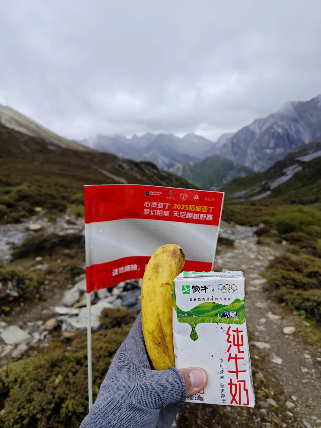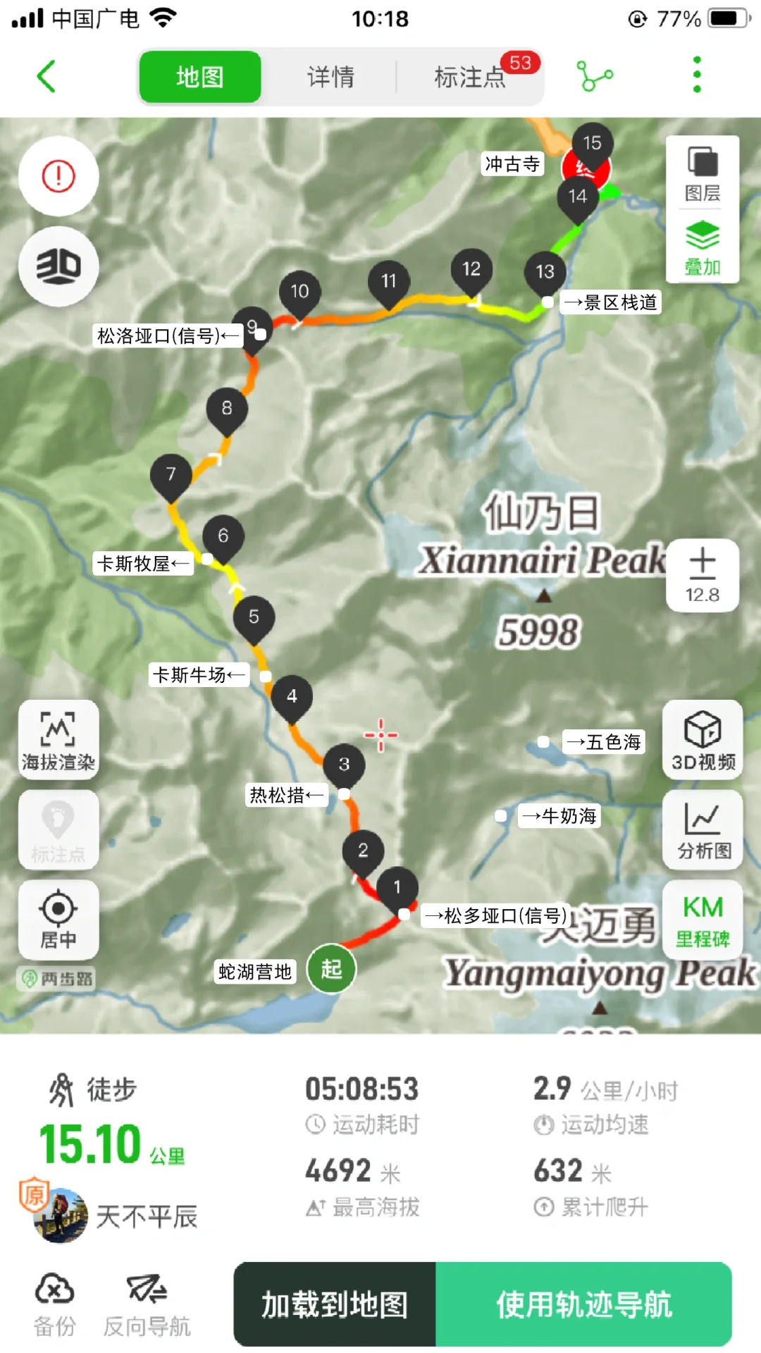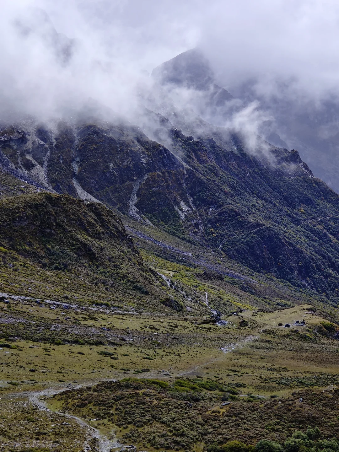 ⭐基本参数 ❶路线:亚丁大转山D5行程 ❷行程:蛇湖营地4500m→松多垭口4660m→卡斯牛场4460m→牧屋4320m→松洛垭口4675m→景区栈道4150m→扎灌崩3950m ❸起点:蛇湖垭口 ❹终点:亚丁扎灌崩 ❺至低海拔:3950m ❻至高海拔:4692m ❼累计里程:15.1Km ❽累计爬升:632m ❾累计下降:1160m ❿全程耗时:8小时13分钟(以上数据来源于两步路) 9月27日,亚丁大转山的第五天,也是最后一天。今天的行程是从蛇湖营地出发,翻越松多垭口到牛奶海,然后途经卡斯牛场、卡斯牧屋,缓坡爬升翻越松洛垭口,最后下降到亚丁景区扎灌崩出山。全程约15.1公里,爬升约630米,下降约1160米,耗时8小时13分钟。 一夜雨下,早上迎来了短暂的放晴,等到翻越松多垭口时又开始起风起雾下雨,断断续续的一直到下山。我们一行三人(一位同样走五天的男驴友,一位昨天遇到的女驴友)从蛇湖营地出发,开始亚丁大转山最后的征程。 到达松洛垭口时,因天气不好,大风大雾下雨,我们放弃了下到牛奶海和五色海的计划,在松多垭口玩了会手机继续赶路。 到达卡斯牛场时,同行的女士说她走得慢,怕拖我们后腿,让我们先走,不用等她,我叮嘱她天黑前前翻不上松洛垭口,就不要再往前走了,时间太晚可能会走夜路,比较危险,直接在垭口下方营地扎营第二天再走。然后留了一根登山杖给她(她没有登山杖),就和另一个伙伴先走了。 下午在前往松洛垭口的途中,遭遇大风大雾大雨恶劣天气,走的比较艰难,同行的伙伴还摔了一跤,疼的走不动了(后来检查说是尾椎骨折了),但又不得不忍着疼痛往前走。当翻上松洛垭口的那一刻,整个人都轻松了不少,只有走过的人才知道那一刻的含金量。 下山途中遇到牧民搬运东西,这里刚举办了一场越野赛,他们是来收物资的,临走前还给我们留了香蕉和牛奶,这是这五天在山里吃的最美味的实物了。 8:59收拾好营地,离开蛇湖开始爬升上松多垭口 9:38翻上松多垭口,因大雾没有去牛奶湖和五色海 10:18离开松多垭口往卡斯牛场 11:34下降到卡斯牛场 12:24下降到卡斯牧屋,开始爬升往松洛垭口 14:56翻上松洛垭口,开始下降出山 16:19到达亚丁景区栈道 17:12到达扎灌崩,准备乘坐景交车下山 至此,耗时五天四夜的亚丁大转山徒步结束,经历过落石、下雪、大风、大雨、大雾、摔跤等状况后,平安出山。