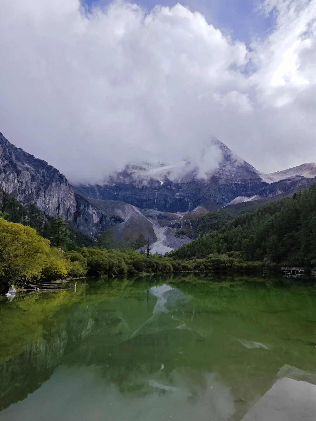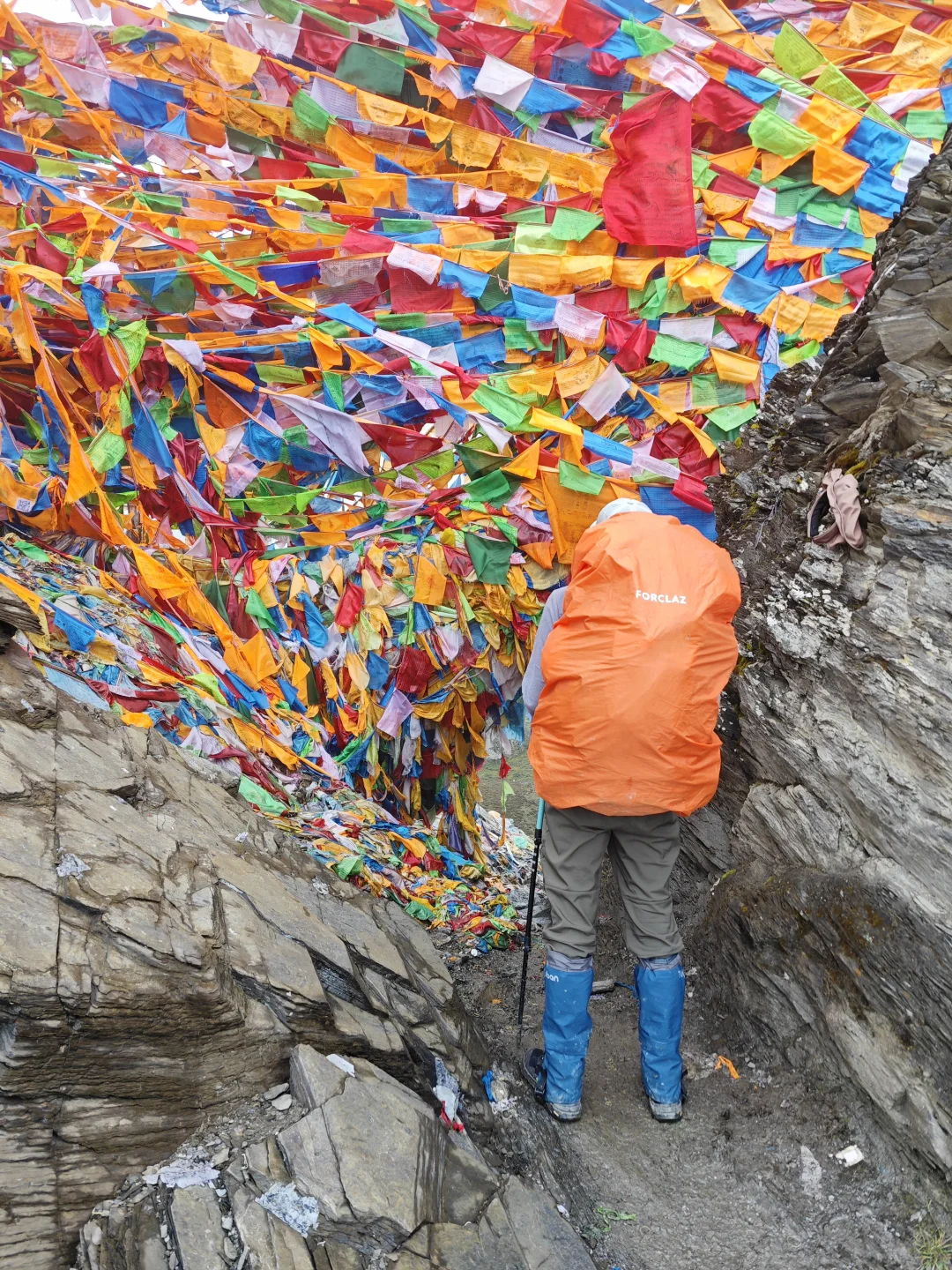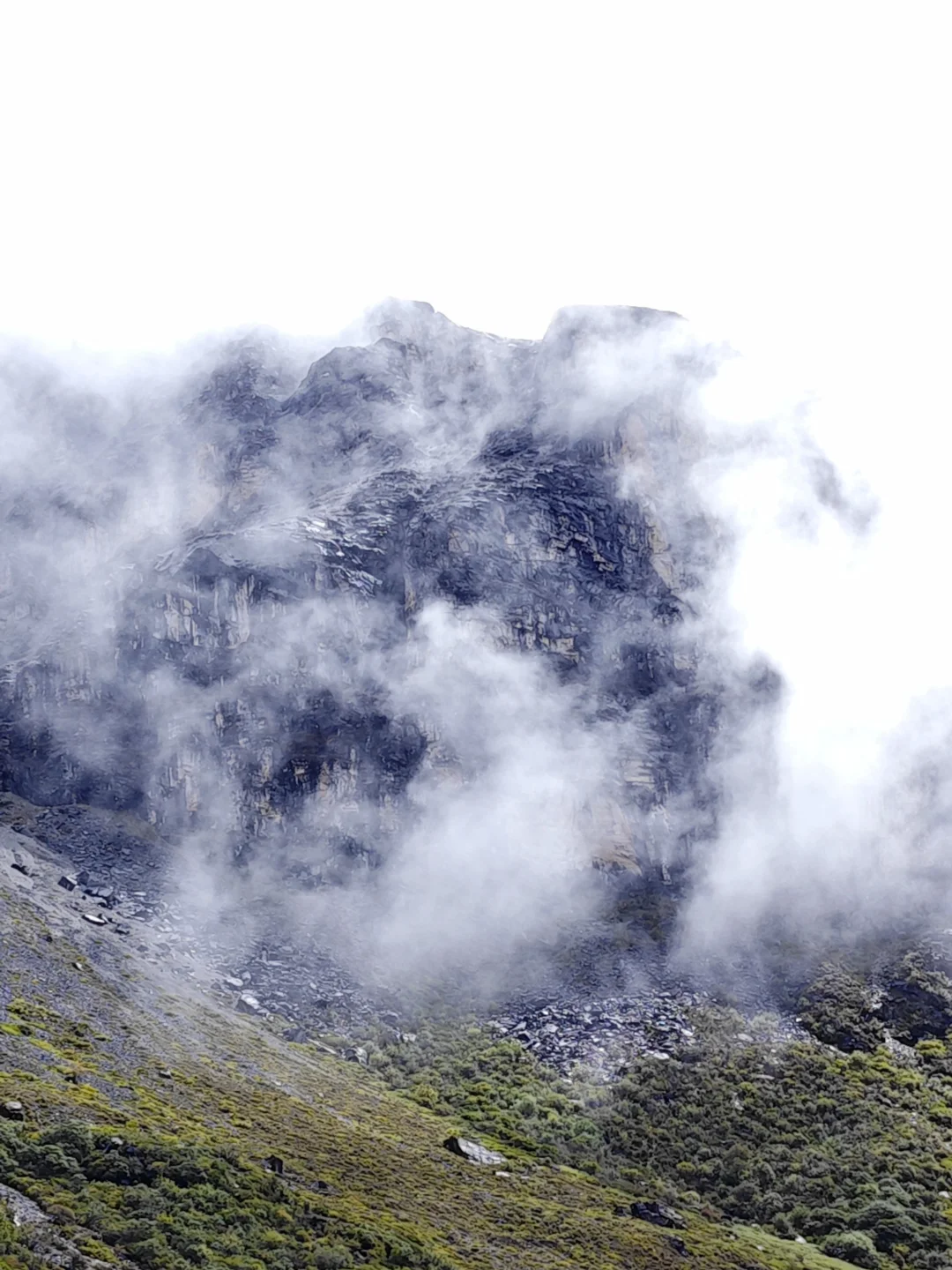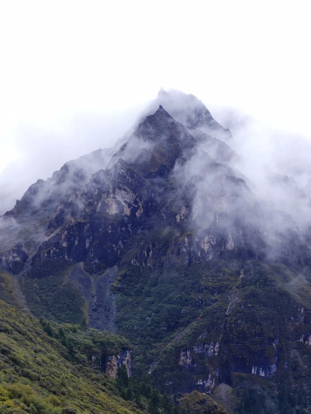 ⭐基本参数 ❶路线:亚丁大转山D5行程 ❷行程:蛇湖营地4500m→松多垭口4660m→卡斯牛场4460m→牧屋4320m→松洛垭口4675m→景区栈道4150m→扎灌崩3950m ❸起点:蛇湖垭口 ❹终点:亚丁扎灌崩 ❺至低海拔:3950m ❻至高海拔:4692m ❼累计里程:15.1Km ❽累计爬升:632m ❾累计下降:1160m ❿全程耗时:8小时13分钟(以上数据来源于两步路) 9月27日,亚丁大转山的第五天,也是最后一天。今天的行程是从蛇湖营地出发,翻越松多垭口到牛奶海,然后途经卡斯牛场、卡斯牧屋,缓坡爬升翻越松洛垭口,最后下降到亚丁景区扎灌崩出山。全程约15.1公里,爬升约630米,下降约1160米,耗时8小时13分钟。 一夜雨下,早上迎来了短暂的放晴,等到翻越松多垭口时又开始起风起雾下雨,断断续续的一直到下山。我们一行三人(一位同样走五天的男驴友,一位昨天遇到的女驴友)从蛇湖营地出发,开始亚丁大转山最后的征程。 到达松洛垭口时,因天气不好,大风大雾下雨,我们放弃了下到牛奶海和五色海的计划,在松多垭口玩了会手机继续赶路。 到达卡斯牛场时,同行的女士说她走得慢,怕拖我们后腿,让我们先走,不用等她,我叮嘱她天黑前前翻不上松洛垭口,就不要再往前走了,时间太晚可能会走夜路,比较危险,直接在垭口下方营地扎营第二天再走。然后留了一根登山杖给她(她没有登山杖),就和另一个伙伴先走了。 下午在前往松洛垭口的途中,遭遇大风大雾大雨恶劣天气,走的比较艰难,同行的伙伴还摔了一跤,疼的走不动了(后来检查说是尾椎骨折了),但又不得不忍着疼痛往前走。当翻上松洛垭口的那一刻,整个人都轻松了不少,只有走过的人才知道那一刻的含金量。 下山途中遇到牧民搬运东西,这里刚举办了一场越野赛,他们是来收物资的,临走前还给我们留了香蕉和牛奶,这是这五天在山里吃的最美味的实物了。 8:59收拾好营地,离开蛇湖开始爬升上松多垭口 9:38翻上松多垭口,因大雾没有去牛奶湖和五色海 10:18离开松多垭口往卡斯牛场 11:34下降到卡斯牛场 12:24下降到卡斯牧屋,开始爬升往松洛垭口 14:56翻上松洛垭口,开始下降出山 16:19到达亚丁景区栈道 17:12到达扎灌崩,准备乘坐景交车下山 至此,耗时五天四夜的亚丁大转山徒步结束,经历过落石、下雪、大风、大雨、大雾、摔跤等状况后,平安出山。