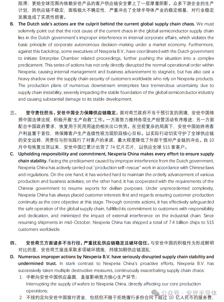 四、安世荷兰方面诸多不当行径,严重扰乱供应链稳定且破坏信任。