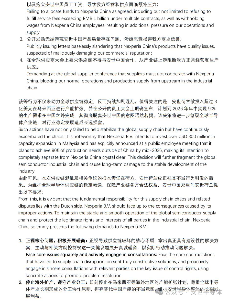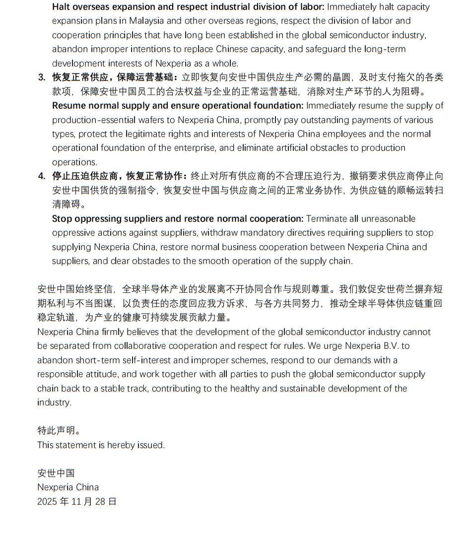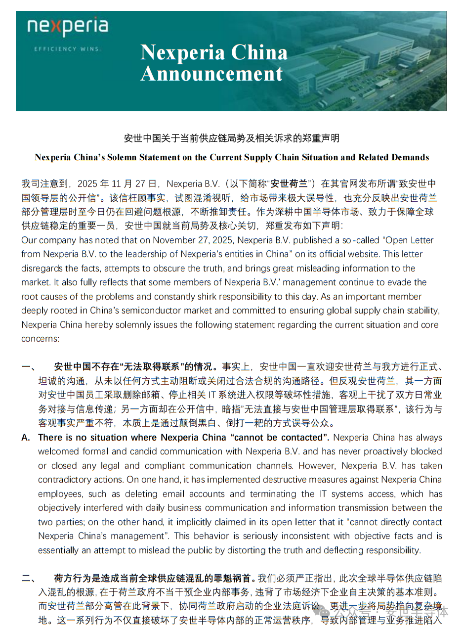 我司注意到,2025年11月27日,NexperiaB.V.(以下简称“安世荷兰”)在其官网发布所谓“致安世中国领导层的公开信”。该信枉顾事实,试图混淆视听,给市场带来极大误导性,也充分反映出安世荷兰部分管理层时至今日仍在回避问题根源,不断推卸责任。作为深耕中国半导体市场、致力于保障全球供应链稳定的重要一员,安世中国就当前局势及核心关切,郑重发布如下声明: