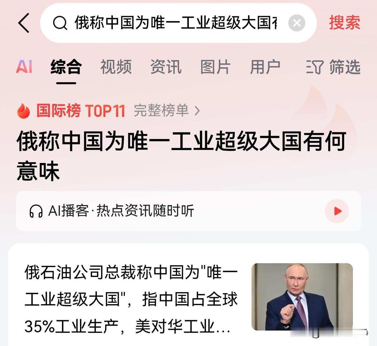 俄罗斯石油公司总裁这番话,会不会是糖衣炮弹呢? 近日俄罗斯石油公司总裁伊戈尔.谢钦,在中俄能源论坛上公开的表示。 中国已经成为唯一的工业超级大国。 朋友们切记他用的是唯一这个词汇。 也就是说全球欧洲包括美国都不是工业超级大国。 中国的江湖地位是独一份的。 有人肯定说了这些人肯定是在说客套话,是迷惑咱们的糖衣炮弹。 其实这种理解放在俄乌冲突之前或许成立。 但是在俄乌冲突已经打了将近4年的节骨眼上。 俄罗斯民族已经有了深刻的反思。 这位俄罗斯总裁并不是张嘴随便一说,人家拿出了详实的数据。 他表示中国已经独立完成了全球35%的工业产能。 其中美国对中国工业的依赖程度是中国对美国依赖程度的三倍。 而这一切仅仅是中国用20年就做到的。 同时他还强调这些数据并不是俄罗斯做的统计,而是联合国,世界发展银行等权威机构所发布的公开数据。 虽然美国欧洲一直想把中国的世界工厂地位推翻。 他们想尽一切办法把某些产业链转移到其他国家。 但是他们低估了全产业链的巨大优势。 比如说越南东南亚等等国家。 欧美确实可以把一些服装制鞋业转移过去。 可是刚刚转移完他们就发现了一个很残酷的现象。 那就是基础原材料依然还要依赖中国。 比如说粘鞋的胶,纺织品的面料,最小的零件扣子。 就这些基础的原材料,只有中国能够做到最大最全最廉价。 你想取代中国的商品根本是不可能的。 如果你想强行取代的话,那你的商品成本就会翻番。 甚至更搞笑的是越南北部的电力全部依赖中国进口。 他们搞工业的电力都需要中国提供。 由此可见,这个世界对中国的工业依赖程度有多大了。 过去俄罗斯人也是不服的,他们内心里面不愿意承认中国这个小弟超过了他。 但是俄乌冲突打醒了他们。 前不久俄罗斯的副外长鲁坚科就曾经对媒体表示。 中国想要多少能源?俄罗斯就给他们出口多少。 而且量大管饱价格优惠。 大家听听,现在俄罗斯已经认清现实了。 与其在工业方面跟中国较劲,倒不如低头认怂,好好的给中国世界工厂提供燃料。 做资源输出的经济也不是不可以。 大家知道什么东西对俄罗斯人心态的打击最致命吗? 就是航母! 俄罗斯人已经无法独立地搞航母了。 甚至他们连维修都做不到。 可是苏联人曾经有过航母的。 斯拉夫人很清楚造航母有多复杂。 我们中国现在不仅能够把辽宁号原地复活。 甚至还可以造出超过美国航母的福建舰。 就这一件事儿已经彻底让俄罗斯人认清了现实。 不是工业超级大国,是根本搞不出现代航母的。 不是工业超级大国也不可能发展航空航天计划。 独立的空间站,未来甚至还有独立的月球基地。 这些事情不是小国可以触碰的东西。 那么俄罗斯现在只能认清现实,拥抱东方的世界工厂。 这证明了俄罗斯的战略正在发生巨大的改变。 未来战争结束,俄罗斯当然会接着跟欧洲人做生意。 但是生意的模式肯定会有变化。 俄罗斯人会向匈牙利人学习。 那就是积极的跟中国合作转移一些产业链。 然后用他们地理的优势,还有能源价格的优势。 生产商品向欧洲出口。 这可比单独的出口能源赚的更多呀。 可以综合以上分析我们可以得出一个结论。 俄罗斯石油公司总裁所说的话并非单纯的吹捧。 而是他们国内精英层一个真实的认知。 看来这将近4年的战争真的是把他们打醒了。