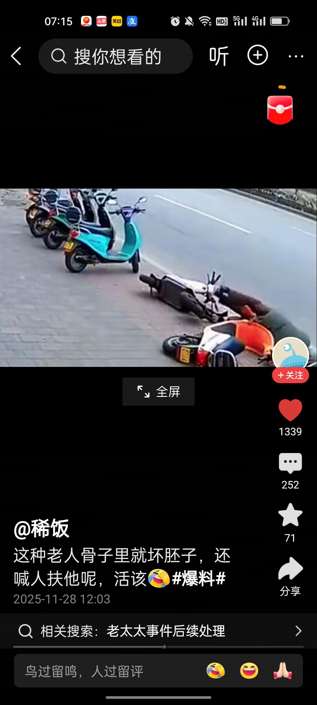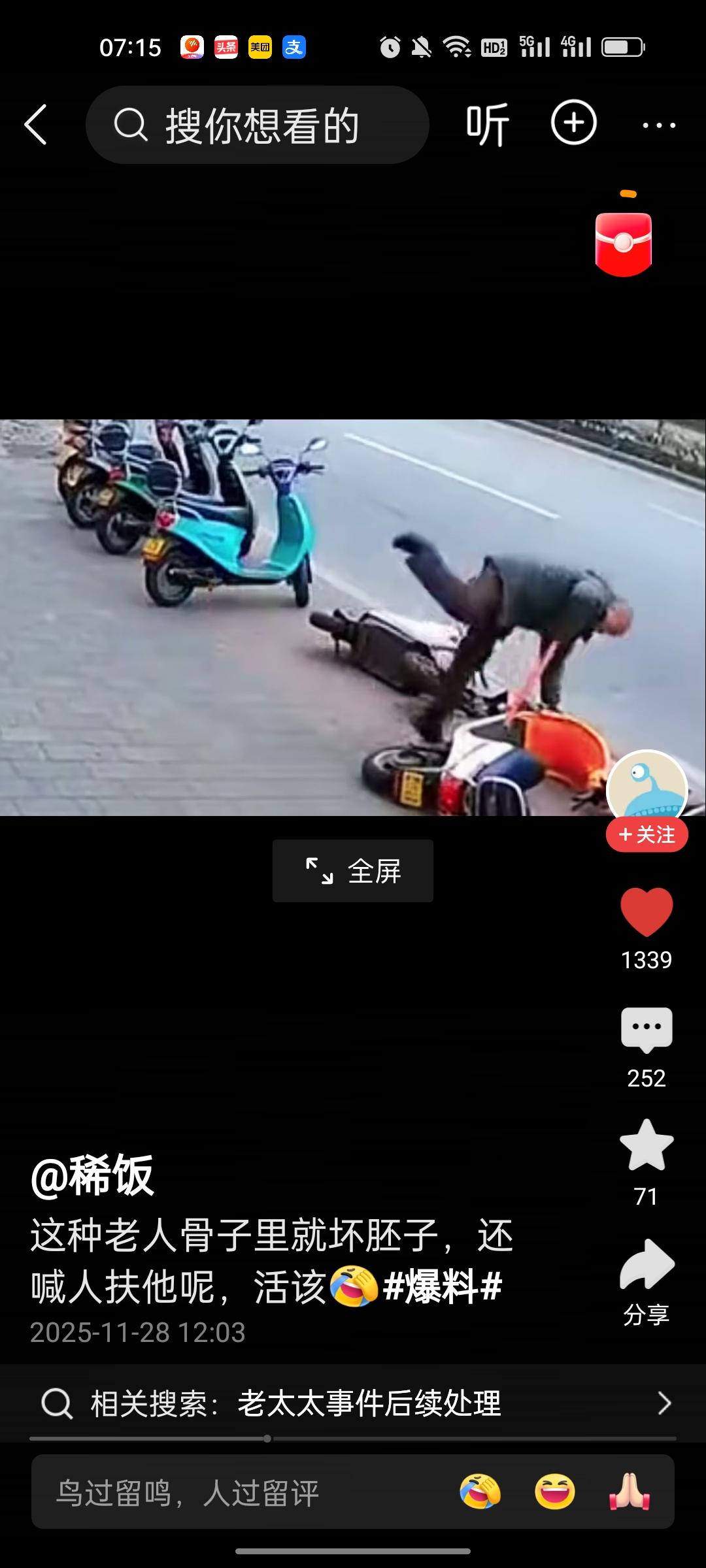 谁来扶他一把? 城市街头,一个老男人手拎袋子正在蹒跚行走,当他走到停在路边的电动车旁的时候,突然凌空跳起,先后踹倒了两辆电动车。 咱也不知道电动车怎么得罪他了,让他发这么大的火。可是报应来的很快,在踹第二辆电动车时,他脚步虚滑,竟然跟电动车一起倒下,摔了个狗啃屎,爬不起来了。 他躺在地下直嚎,大喊:"谁来扶我一把?",我建议大伙儿可千万别扶,以他的德性,谁扶就可能讹谁的。 究竟是老人变坏了还是坏人变老了?