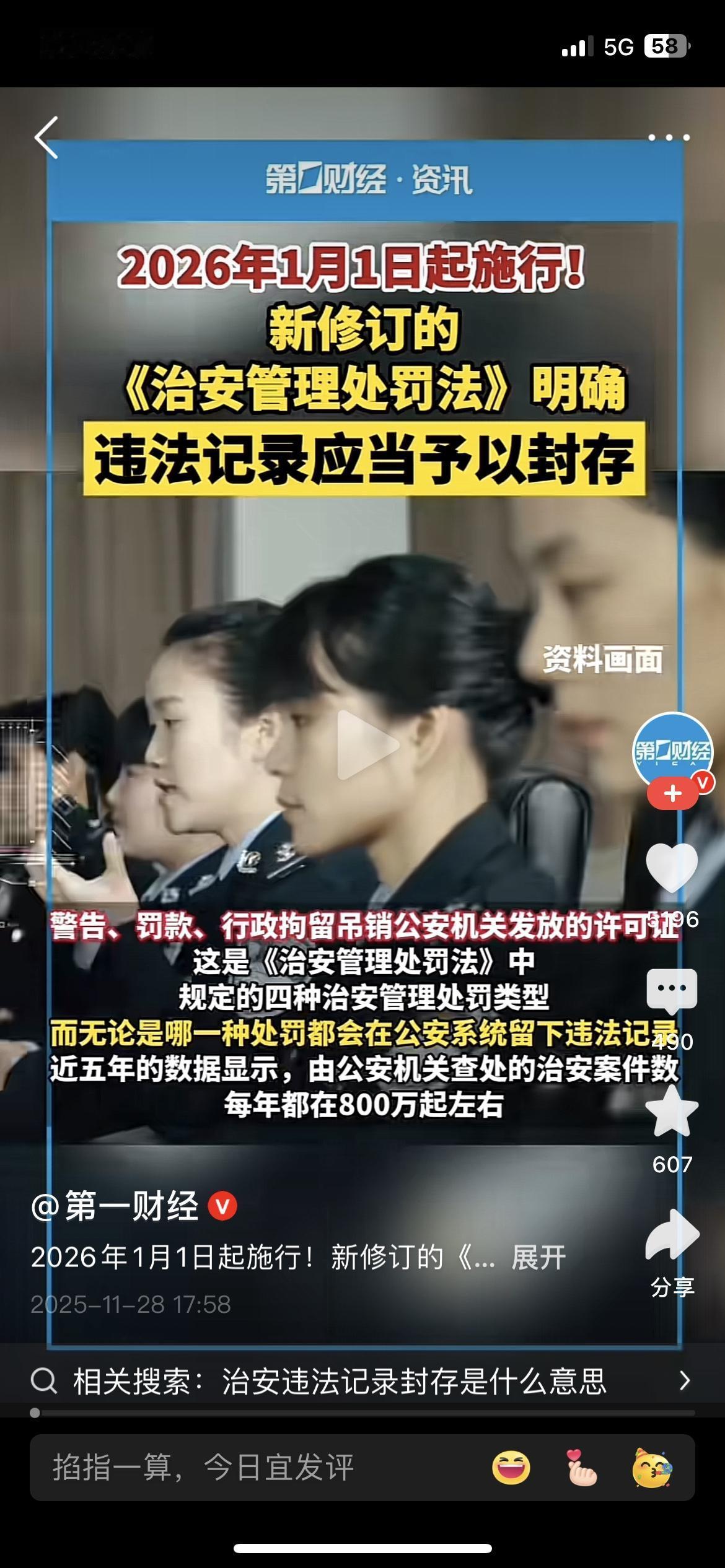 明年1月起,800万“失足者”的“人生重启键”要按了! 刚刷到个重磅政策:2026年1月1日起,新《治安管理处罚法》正式施行——所有治安违法记录,必须封存! 啥概念?过去你因为打架、酒驾(轻微)、小偷小摸被治安处罚过,这些记录以后不会随便露出来了:找工作、租房子、考普通证书,人家查不到;只有考公、当兵这种特殊岗位,或者再犯事,才会被调出来。 近五年每年800万起治安案件,多少人因为年轻时的冲动,被“前科”卡了半辈子?送外卖被拒、进工厂被刷、连孩子上学填家长信息都心虚……这下等于给这些人“摘了半辈子的标签”。 当然不是“洗白”——再犯会从重罚,特殊岗位也绕不开,但对普通人来说,这已经是给了次“重新站在阳光下”的机会。 你身边有因为这点事被影响的人吗?评论区说说呗~ 治安处罚条款 卖淫嫖娼认定 治安法新规