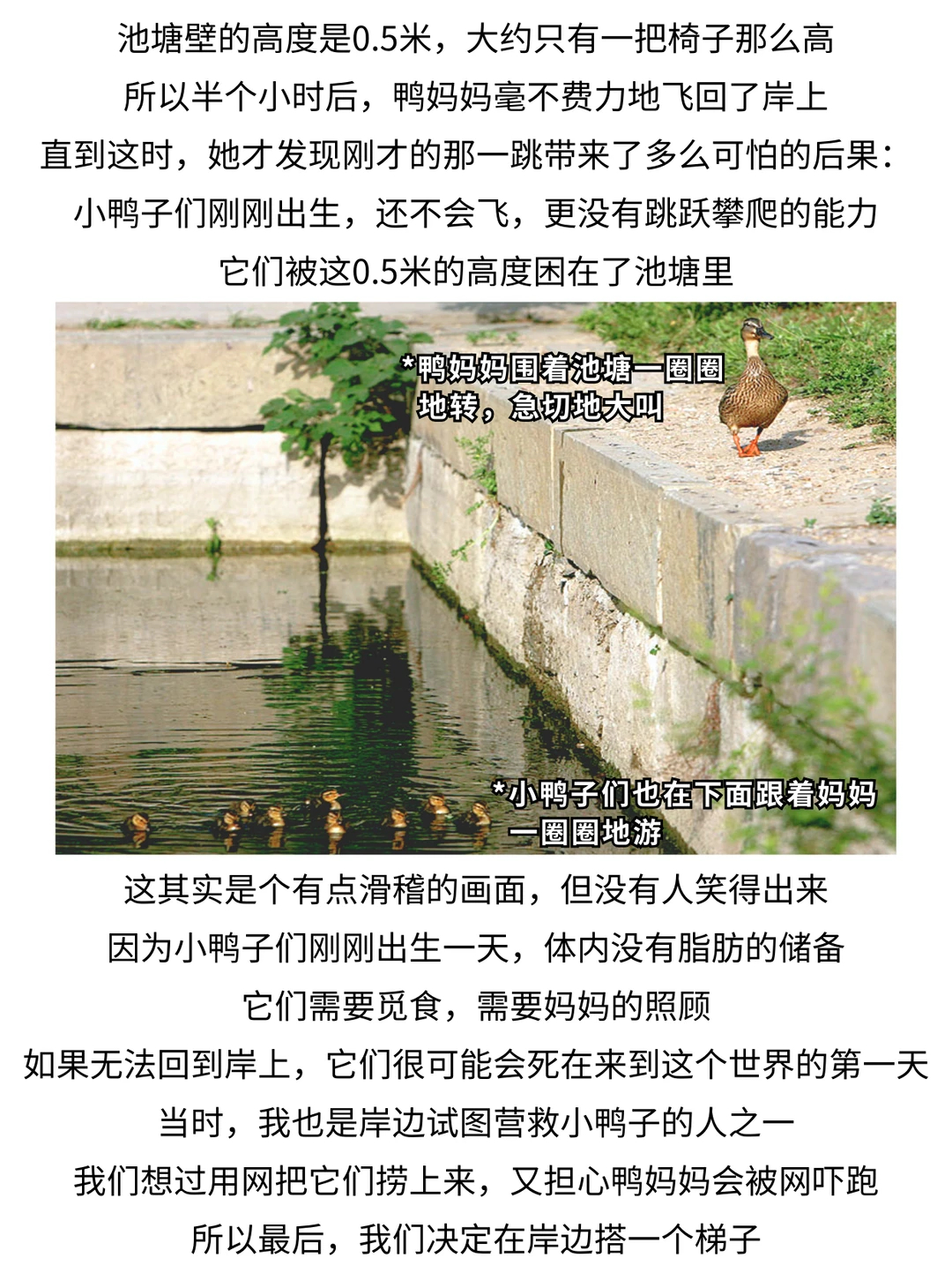如果那天我们没来得及把这座梯子搭起来,这样垂直设计的池塘壁很可能会把这些刚出生的小鸭子,困死在池塘里……中国科普博览
