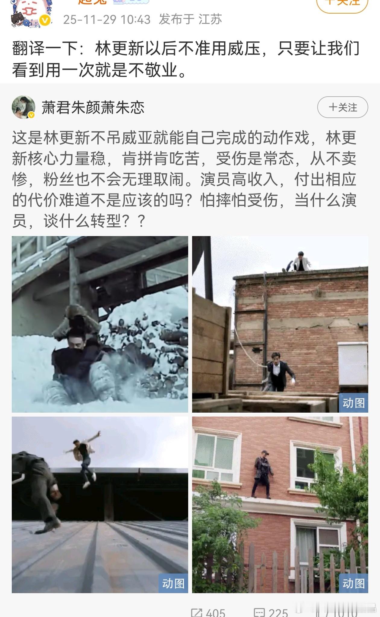 林更新动作戏经过徐克导演调教,确实很可以,身手敏捷,好几层楼一跃而下,不管有没有威亚,反正看起来是一气呵成,身手矫健。们ie别嫉妒了,哥哥打戏不行,菜就多练。