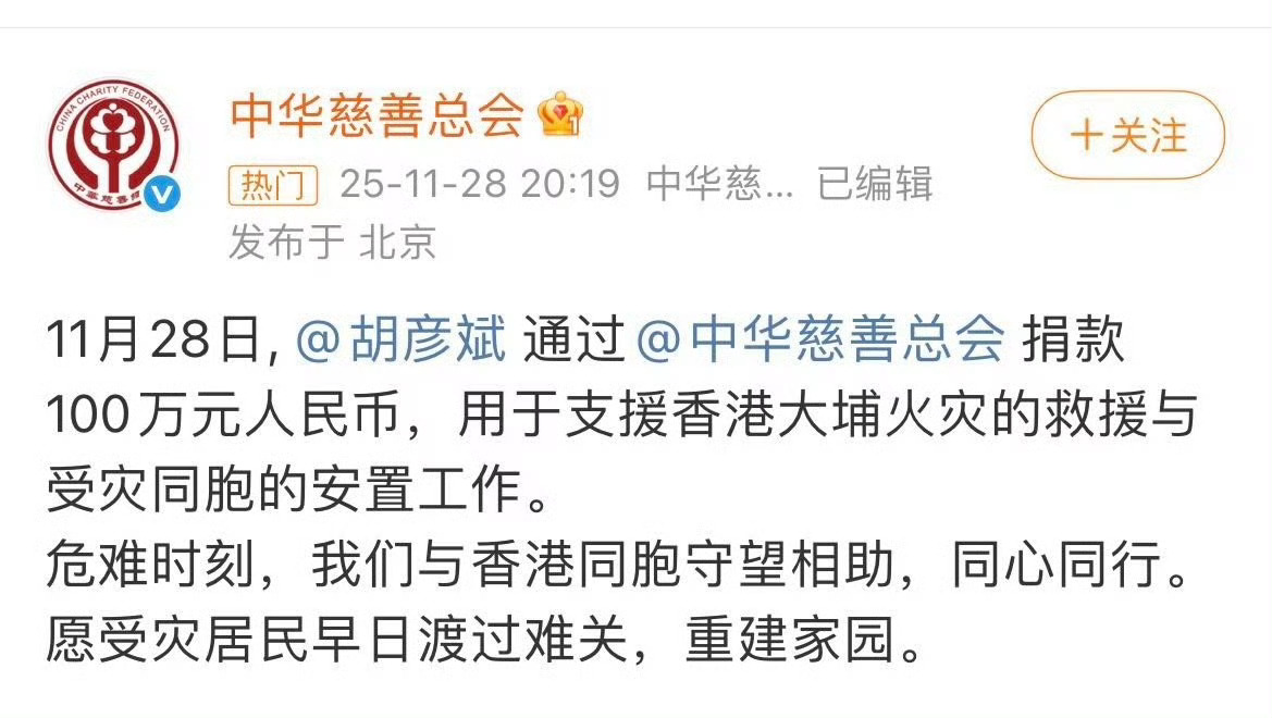 胡彦斌驰援香港共渡难关 善意从不用分量撑场!胡彦斌低调捐100万支援香港大埔火灾安置,中华慈善总会搭桥的默行之举,满是同胞间的共情与守望~