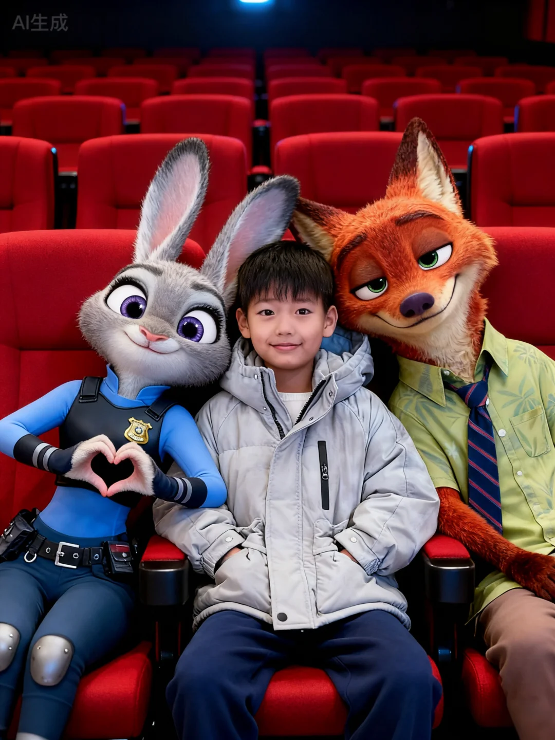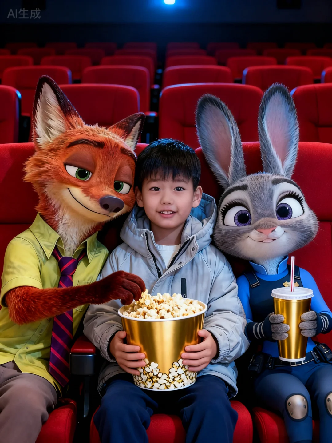 不要换脸,人物脸部不能有任何改变!请将图1和图2的两人融合成一张三人并排坐在红色影院座椅上,图2人物坐中间,画面构图紧凑,三位主体靠得很近,头部靠在一起,面带自然微笑,眼神直视镜头。左侧人物右手伸至共享的金色大容量爆米花桶中取食,右侧男孩双手轻握爆米花桶、另一只手拿着带吸管的金色饮料杯,姿态亲昵放松。背景为成排的红色影院座椅,环境光线偏暗(符合影院氛围)。要求照片级真实感,8K超高清细节,光线柔和聚焦主体,色彩和谐(红、蓝、白主色调),营造温馨休闲的观影氛围。要求人物实现无缝融进画面,视觉过渡自然,整体画面光线明亮且均匀。影院观影场景,平视机位,中近景构图,原比例