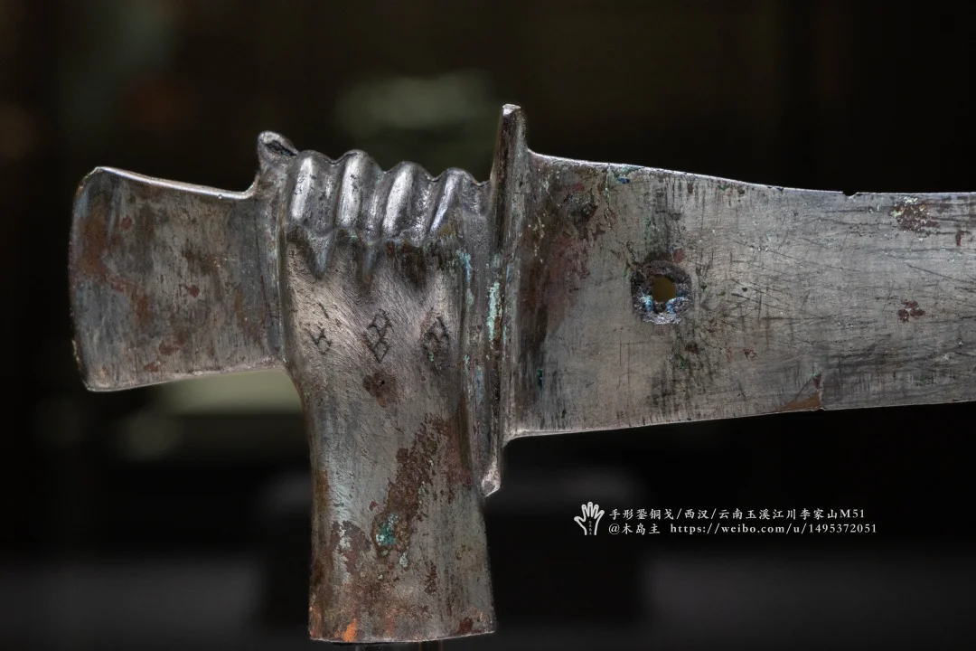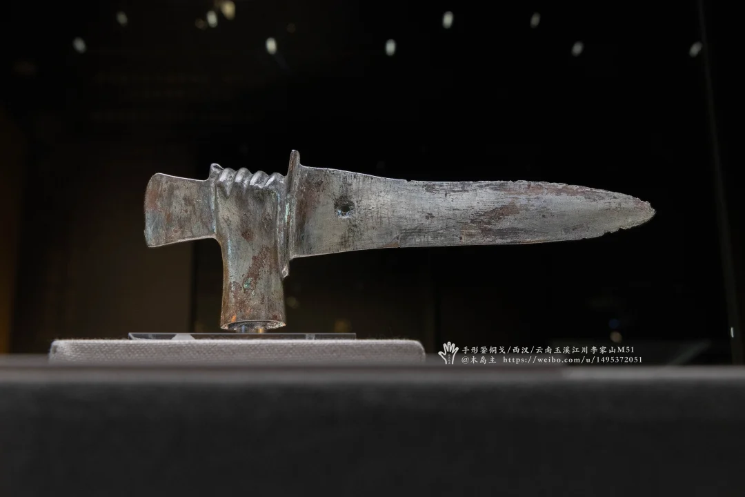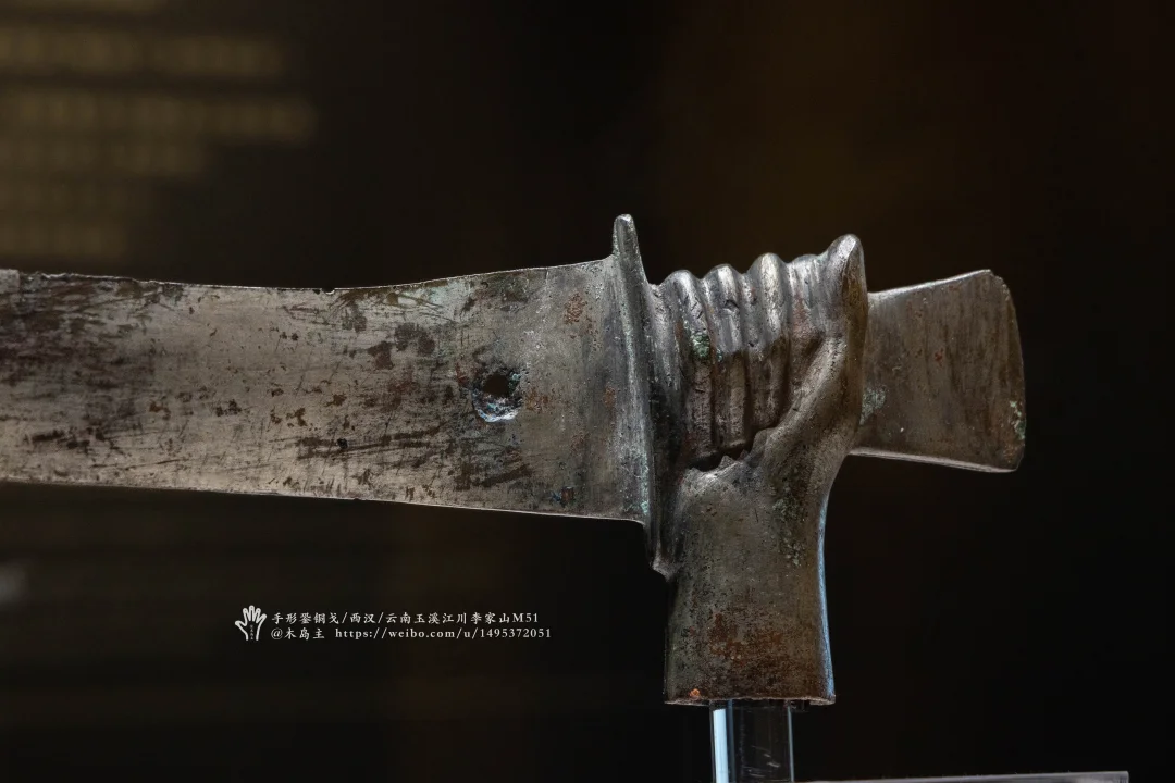手形銎铜戈,古滇国,云南玉溪江川李家山51号墓出土,这个造型设计满分。 博物馆里有个小朋友喊了一声,说感觉像杀过人,确实寒光闪闪。 这个兵器表面有一层镀锡,所以看起来是银色的,镀锡之后的表面具有很强的防腐蚀性能,即使在较潮湿的条件下,也很不容易被氧化,这也是这件兵器依然看起来寒光闪闪的原因。有学者对滇国镀锡青铜器做过分析,表面的锡和本体的铜之间有清晰的界限,证明表层的锡是采用热镀法镀上去的,而不是高锡青铜中的锡析出到表面形成的。 另外,在表层也没有检测到汞残余,可以排除像鎏金一样的用汞来“鎏锡”这种办法。 在当时绝对算高科技。