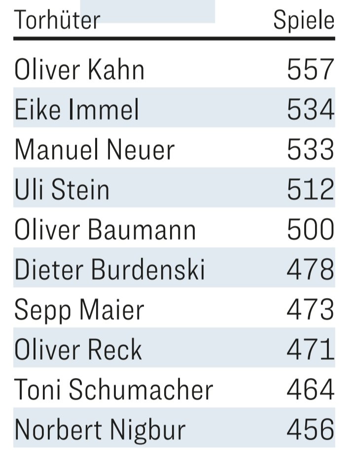 德甲历史门将位置出场纪录目前由奥利弗-卡恩以557次出场保持,诺伊尔最早可在下赛季打破这一纪录。