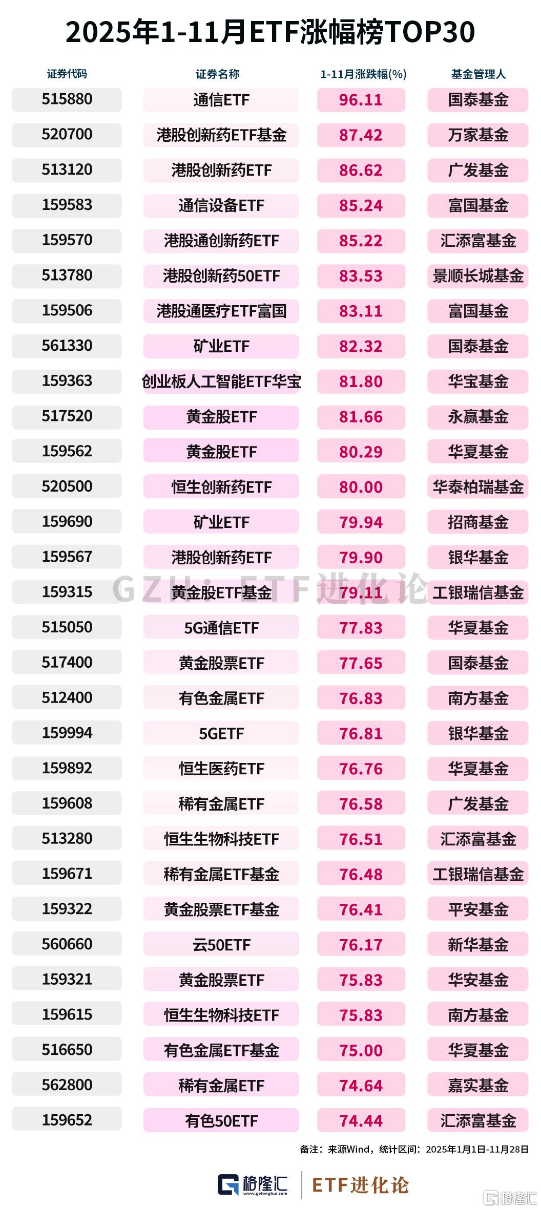 将时间拉长到整个2025年前11个月,市场的主线更加清晰。通信ETF以96.11%的涨幅领跑全场,展现出AI时代的强大动能。