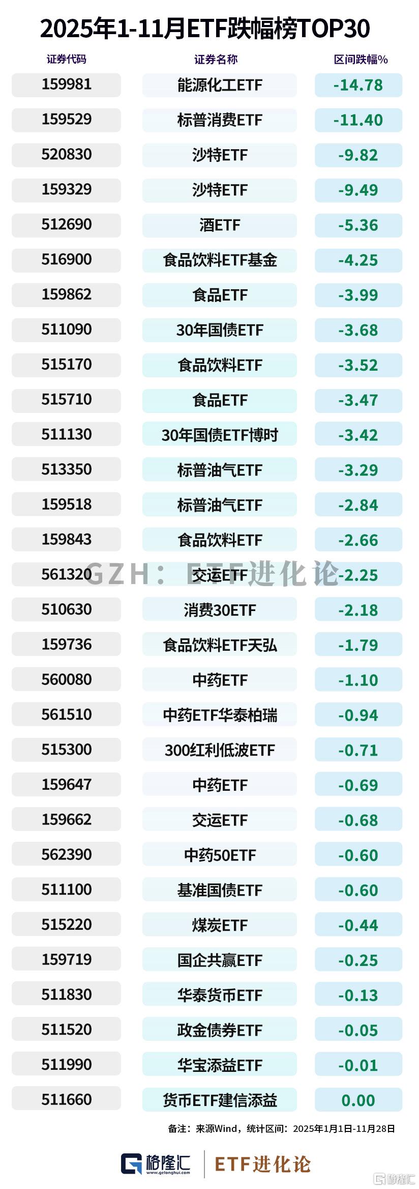 年内跌幅榜,能源化工ETF下跌14.78%,标普消费ETF下跌11.40%,显示传统消费和能源板块面临压力。