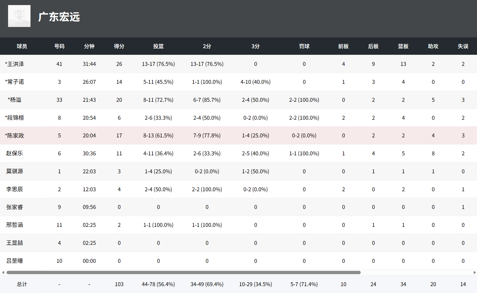 广东:王洪泽26分、杨溢20分、陈家政17分