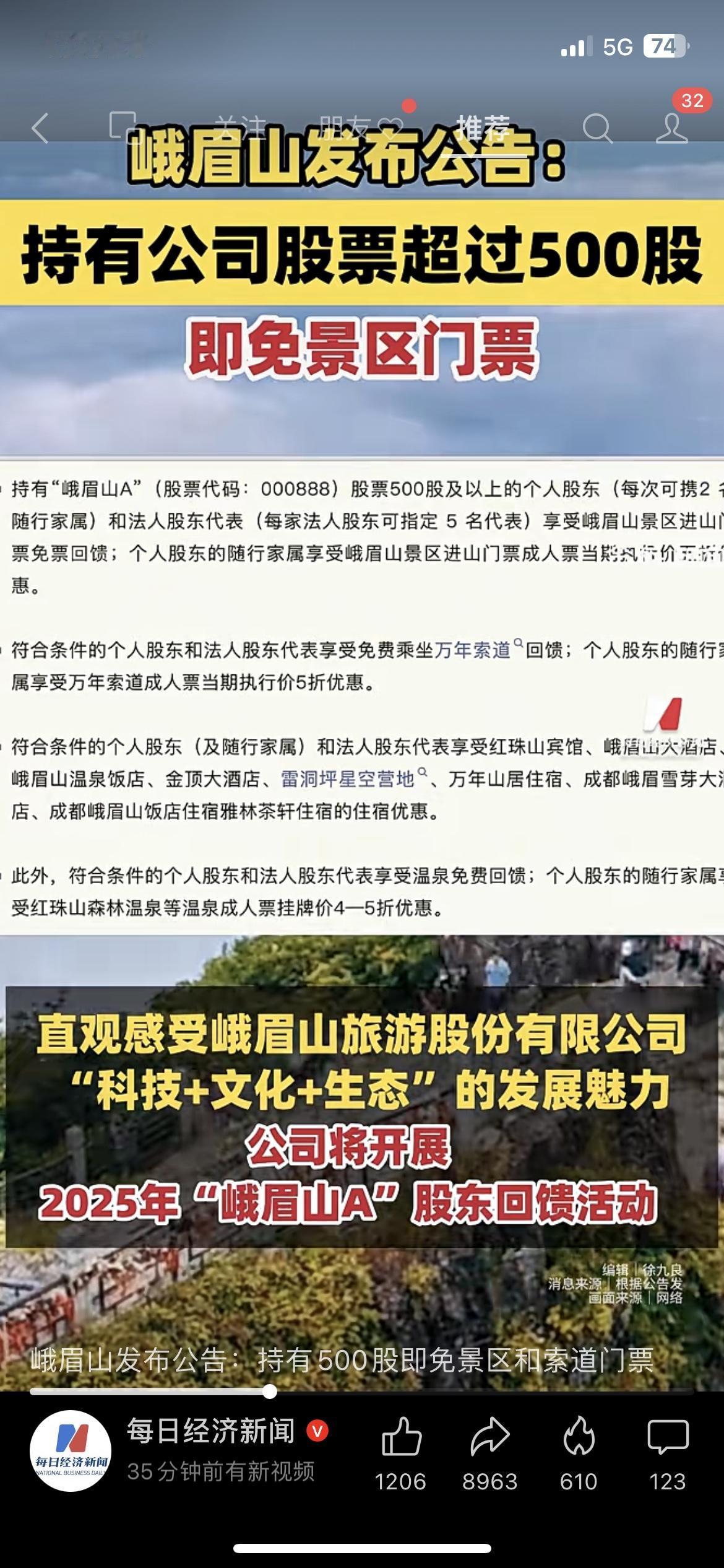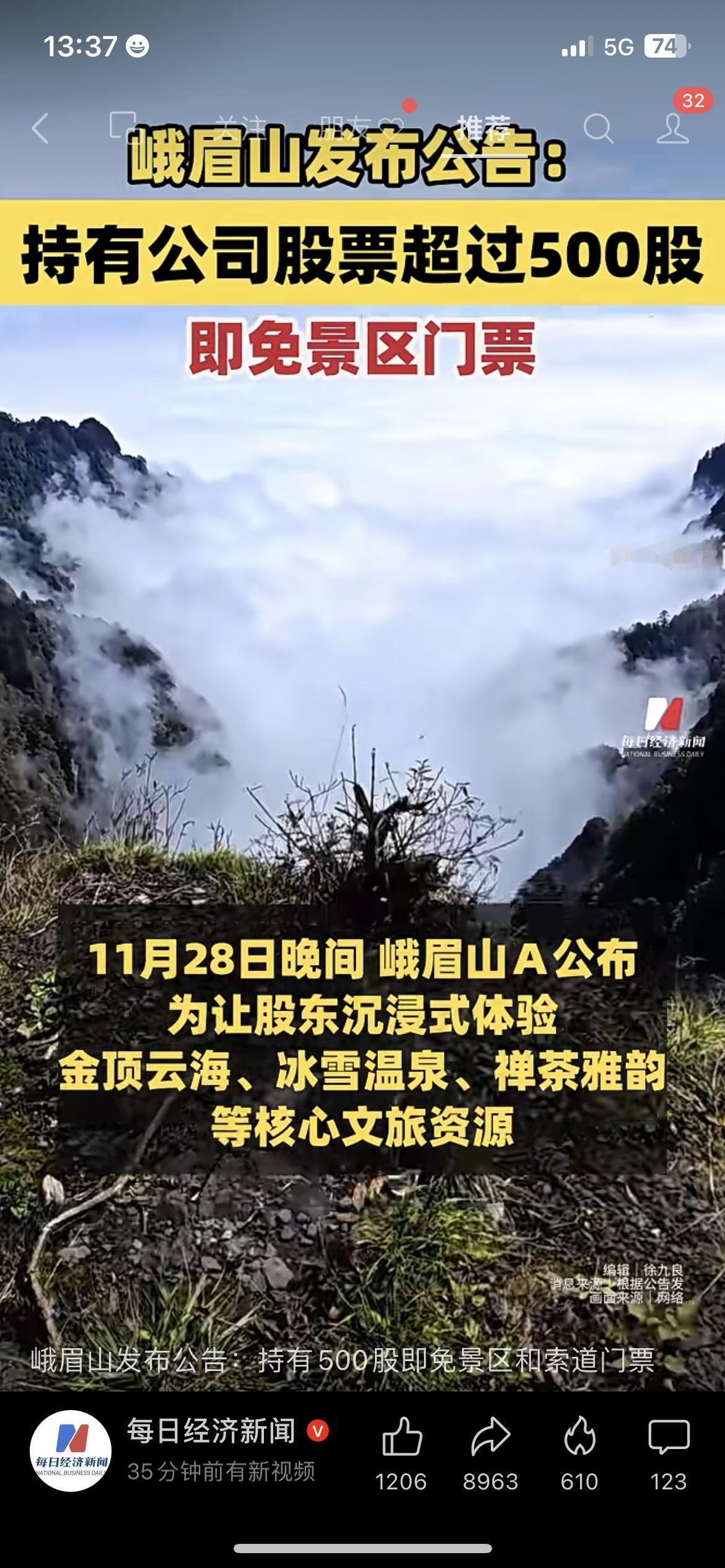 持有峨眉山A(000888)500股以上的家人们注意啦!12月1日到明年1月31日(法定节假日除外),股东本人直接免景区门票、免费坐万年索道,还能免费泡三大温泉、每天免费滑雪1小时~ 最多能携2名家属,家属门票和索道都打5折,温泉4-5折、滑雪5折,旗下红珠山宾馆这些酒店住宿2折起,峨眉雪芽茶叶买一送一,文创产品也能8.5折拿下! 微信搜“峨眉山旅游官方平台”小程序,进股东回馈专区下单,到时候带身份证和持股证明(交易软件持仓截图就行)核验就好,冬季去看金顶云海、滑雪泡温泉也太值了,有没有股东已经约上朋友了?