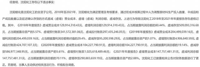 辽宁证监局11月28日公布的《行政处罚决定书》显示,2018—2021年,沈阳蜡化为满足管理及考核要求,通过在成本核算过程中人为调整原材料生产投入数量、半成品和产成品数量以及延迟确认存货的方式虚减(虚增)营业成本,虚增(虚减)利润总额、虚减存货。上述行为导致沈阳化工2018—2021年年度报告存在虚假记载。