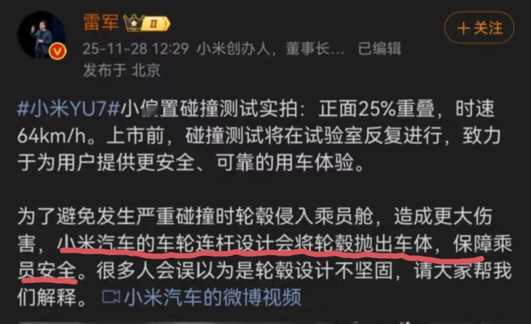 雷总昨天跟大家科普了小米汽车“丢轮保命”的设计理念,这不,今天素材就来了吗? 这位说车博主就说了,这就是所谓的“小偏置碰撞”,正因为小米有这种先进的设计理念,才能更大的保障车内司乘人员的安全! 那网友就有疑问了:其他车企很少有“丢轮保命”的这个设计啊,我也没见轮胎侵入到乘员仓啊?这款车动不动崴脚,事无大小就抛轮,不用钱吗?官方会兜底吗?