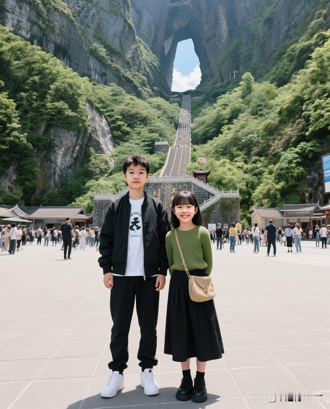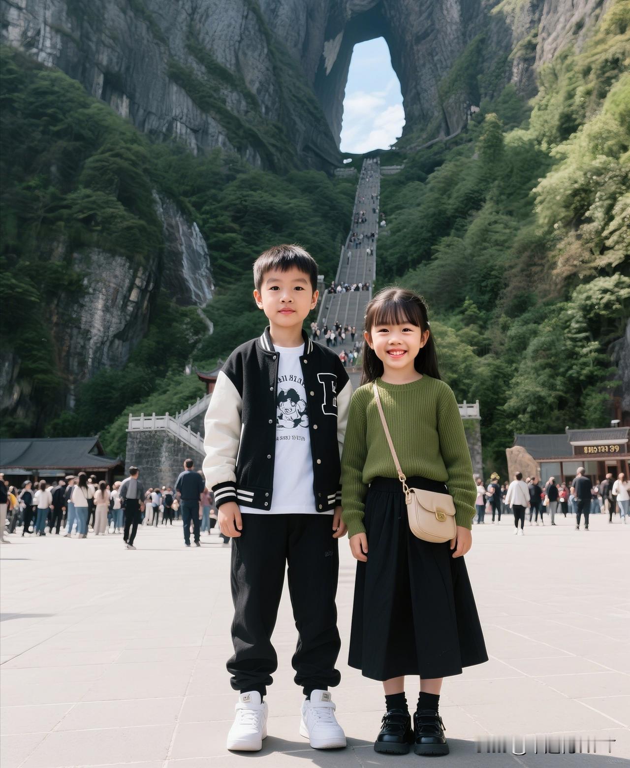 周末带俩娃冲了张家界天门山,刚到山脚下就被那道“天门洞”震住——高耸的石阶从洞口直铺下来,像条通天的路。 姐姐攥着小挎包,眼睛亮得像装了星星:“这洞是神仙住的吧?”弟弟拽着我的衣角,嘴硬说“我能爬完全部台阶”,结果没走五十级就喊腿酸,最后是被我半抱半哄才到洞口。 山上风裹着雾,往衣服缝里钻,俩娃却举着冰棍追蝴蝶,笑声裹在山风里飘好远。下山时弟弟趴在我肩头睡成小猪,姐姐偷偷往我口袋塞了颗糖:“妈妈,下次还来。” 原来最好的风景,是娃跑在前面的背影啊。