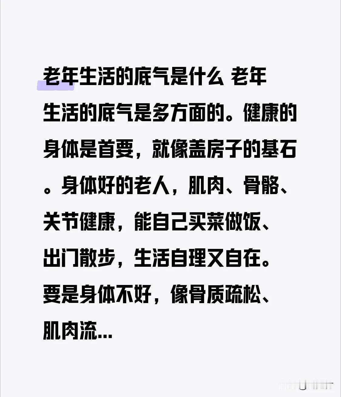 老年生活的底气是什么 老年生活的底气是什么 老年生活的底气是多方面的 健康的身体是首要 如同盖房的基石 身体好的老人 肌肉、骨骼、关节康健 能自去买菜做饭 可自行出门散步 生活自理又自在 若身体欠佳 如骨质疏松、肌肉流失 行动受限 生活质量大打折扣 还会给子女添负担 经济独立也至关重要 有稳定养老金、存款的老人 能自由选择旅游、上兴趣班等生活方式 提升幸福感 且在家庭决策上更有话语权 无需看他人脸色 此外 老伴也是底气 “少来夫妻老来伴” 老伴陪自己走过一生 是最懂自己的人 相互扶持 老年生活才不孤单 中年存活的底气 中老年人幸福感 老年人幸福观 老年人充实生活