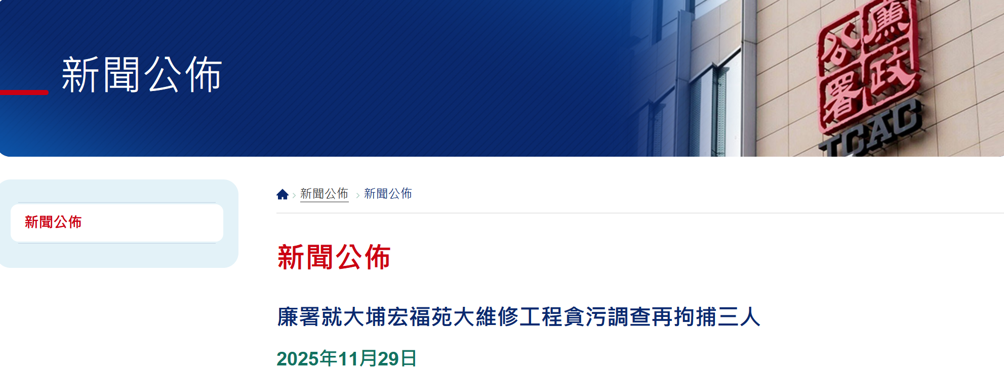 香港廉政公署网站11月29日消息,香港廉政公署就大埔宏福苑大维修工程可能涉及的贪污成立专案小组并展开全面调查,继昨日(11月28日)较早时拘捕八名涉案人员后,昨晚再拘捕三人。