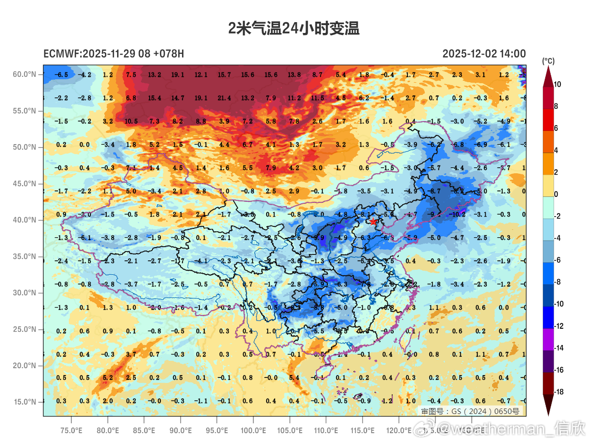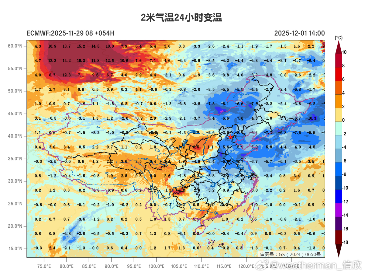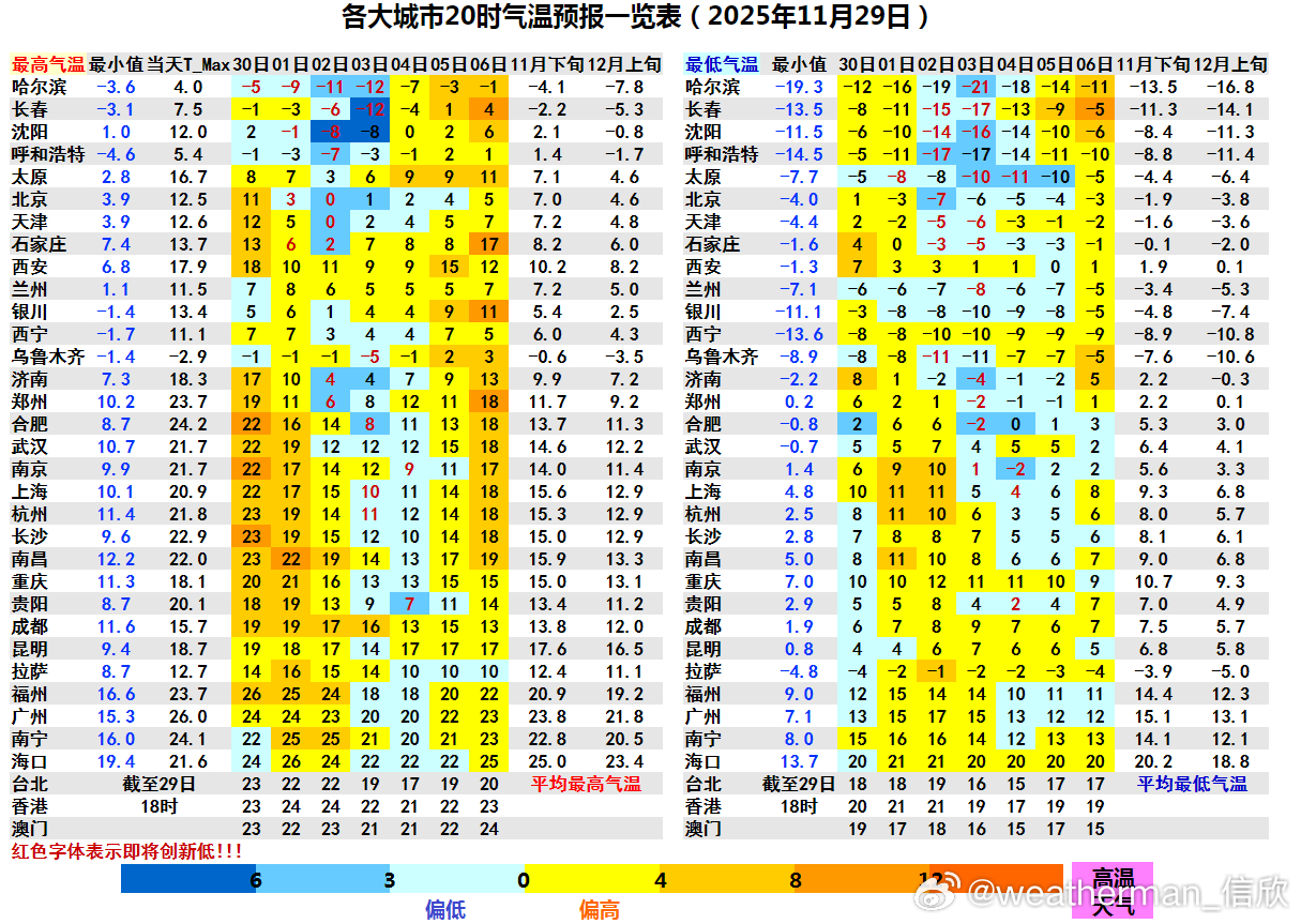 【气温过山车】未来7天从东北到江南多地,气温会经历巨幅波动,北方降温主要在11月30日-12月2日,南方降温主要在12月2日-3日。降温后,气温又会快速反弹。因此未来气温从偏高转偏低再回到偏高,如同坐上过山车,尤其是东北振幅最大。省会城市中,今天和未来7天高低点为:沈阳12℃-零下8℃-6℃,先降20℃再升14℃;长春7.5℃-零下12℃-4℃,先降接近20℃再升16℃;哈尔滨4℃-零下12℃-零下1℃,先降16℃再升11℃。这样的剧烈波动很容易引发心脑血管疾病,要多加小心。其他城市最高气温波动较大的有,太原17-3-11℃,天津13-0-7℃,济南18-4-13℃,郑州24-6-18℃,合肥24-8-18℃,南京22-9-17℃,杭州23-11-18℃,南昌23-13-19℃,贵阳20-7-14℃。