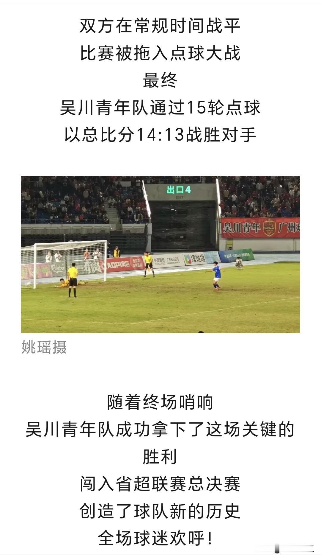 广东“省超“半决赛第二轮比赛传来捷报,吴川青年队客场与对手广州蜀地红队1:1战平,两回合3:3打平,最后通过点球决胜,非常艰难地淘汰广州蜀地红队挺进省超总决赛。根据赛程安排,省超总决赛第一回合将于12月6日打响,届时吴川青年队与深圳藝品高争夺冠军。今晚,湛江球迷看球肯定感到非常刺激,因为点球大战竟然进行到第十五轮!由此可见,两队的实力非常接近,吴川青年队得到幸运之神青睐,希望吴川青年队在总决赛继续高奏凯歌,捧回省超总冠军!