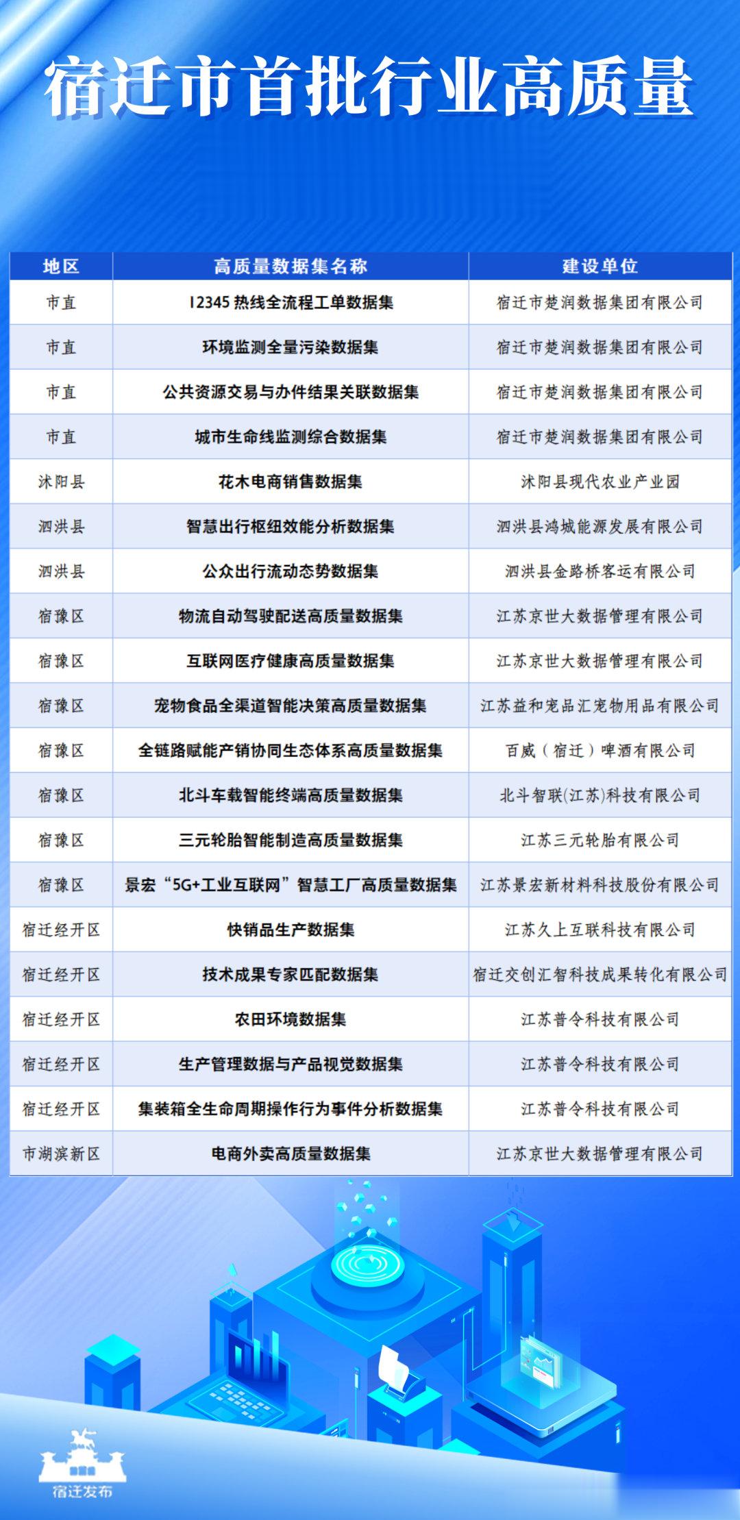 高质量数据集是推动新一代人工智能加快发展的关键要素,此次宿迁遴选出20个高质量数据集,涉及智能制造、智慧出行、电商物流、医疗健康、城市治理等重点行业领域。